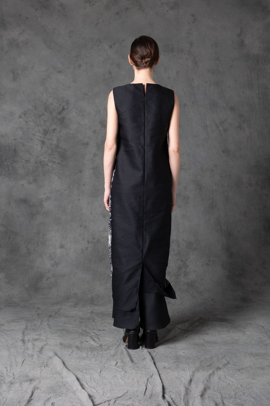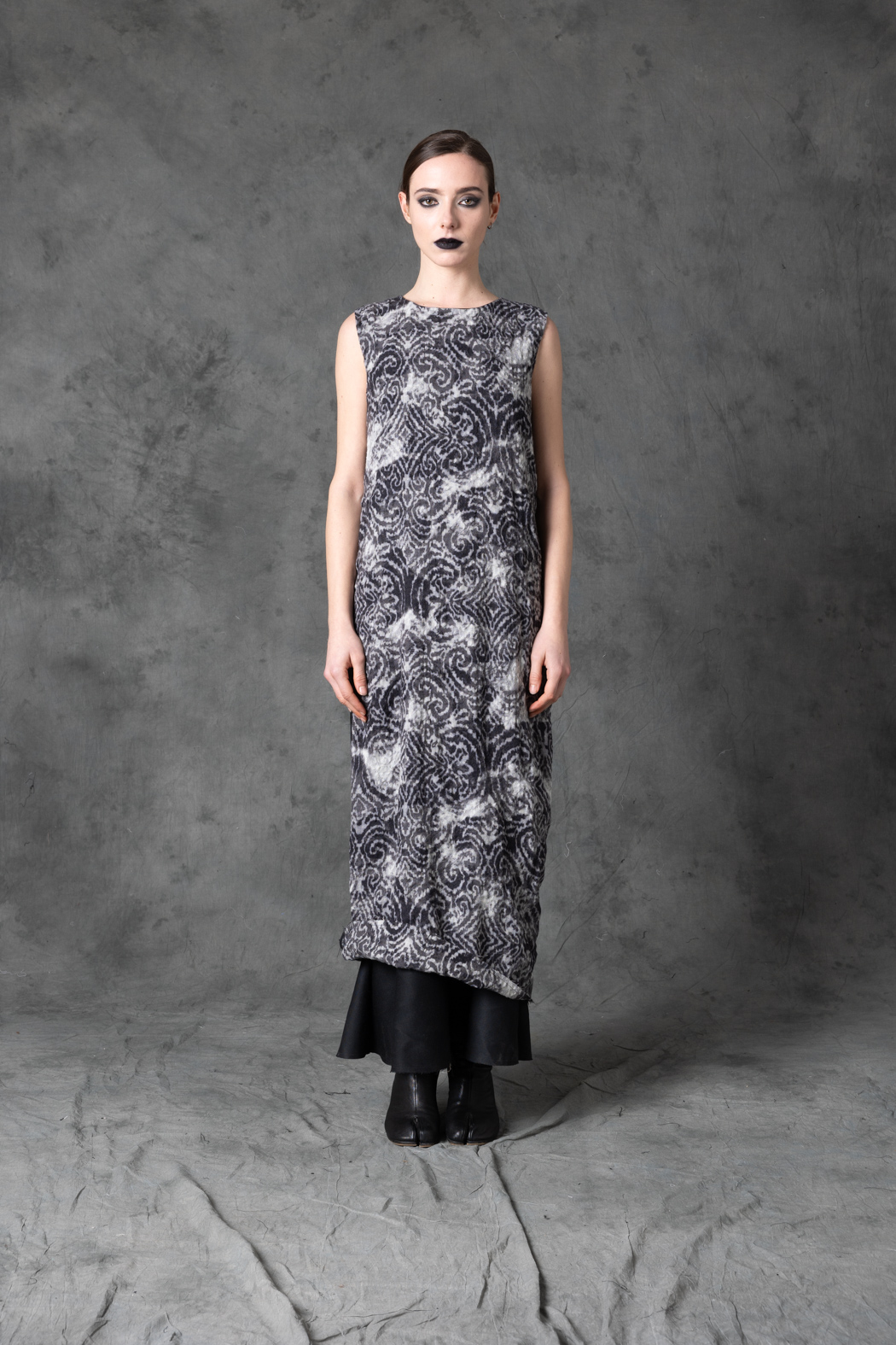 A multi-fabric dress blending wool, cashmere, silk, and cotton. Layered textures and subtle contrasts give the piece an experimental, transformative character—true to its name.