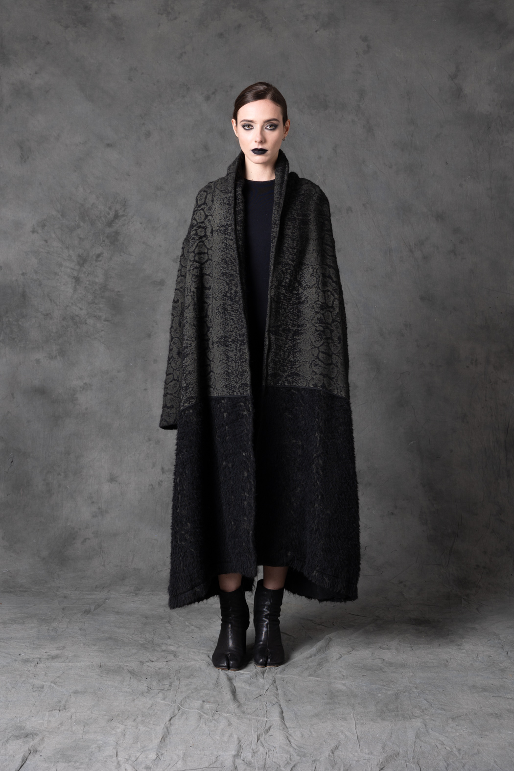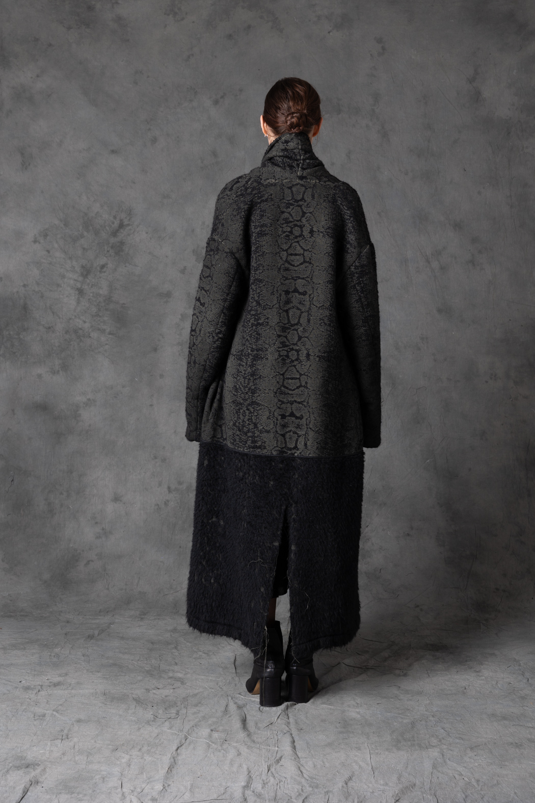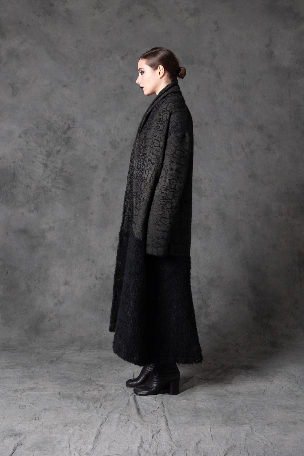 A chesterfield reinterpreted through an avant-garde lens. The crocodile-textured fabric brings dimension and mystery, while the elongated line keeps the silhouette solemn and refined. A statement of quiet intensity.