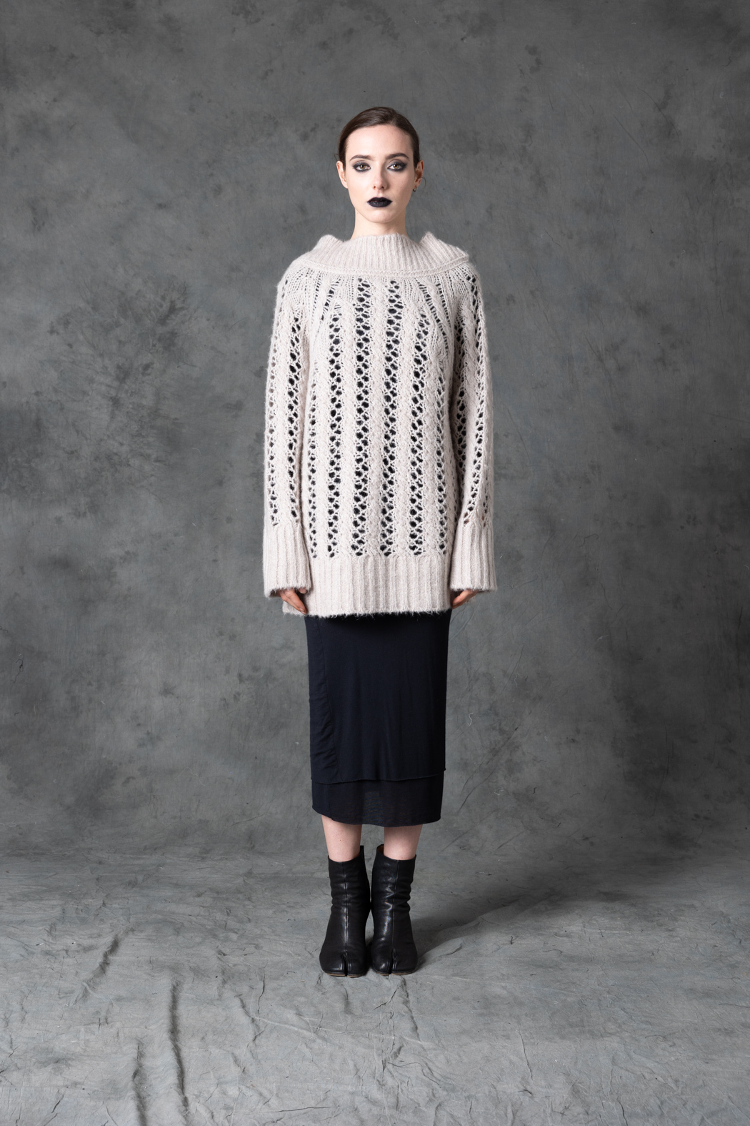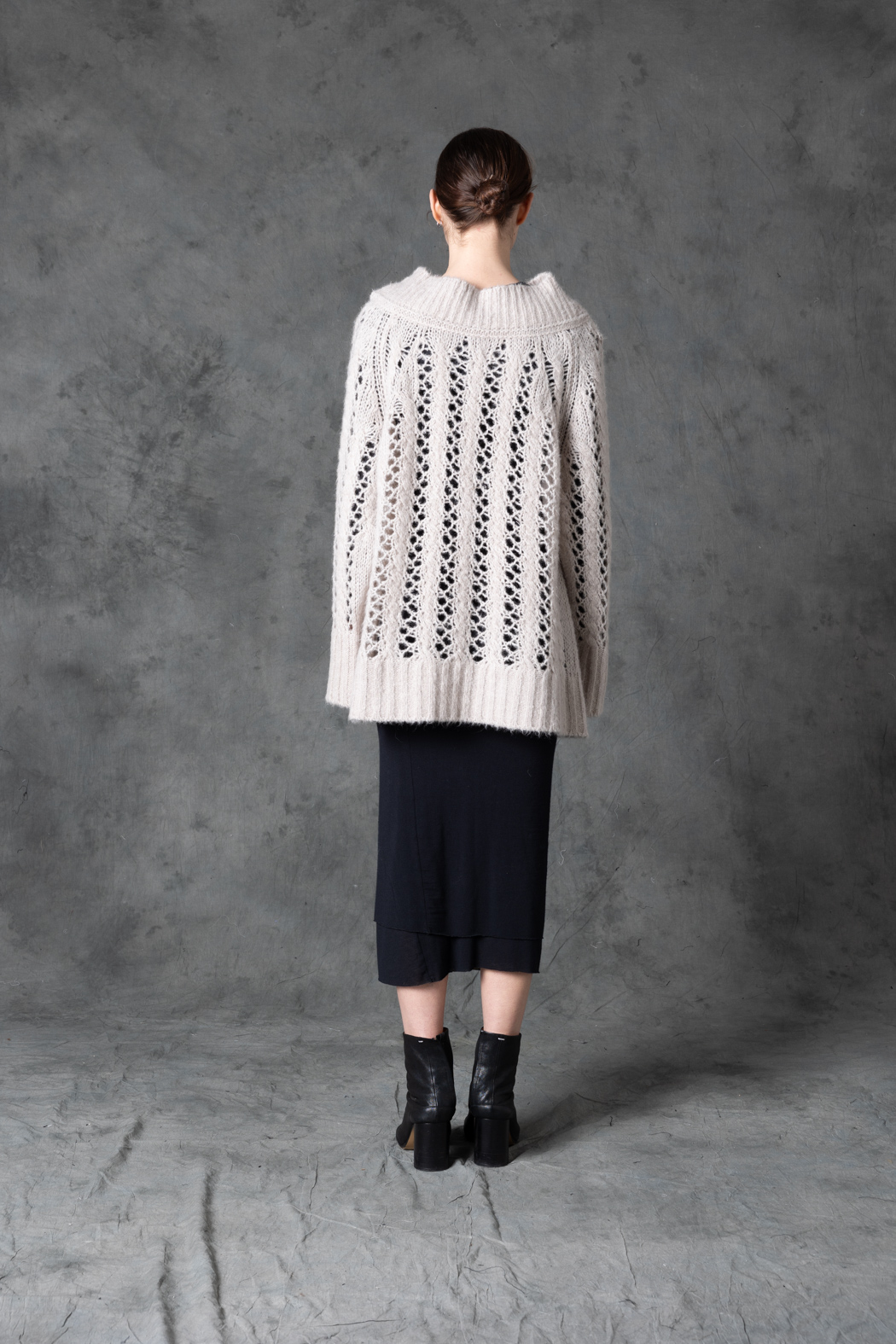 A baby-alpaca sweater featuring a subtle lace-like knitted pattern. Structured yet delicate, it brings a feminine, experimental nuance to winter layering.
