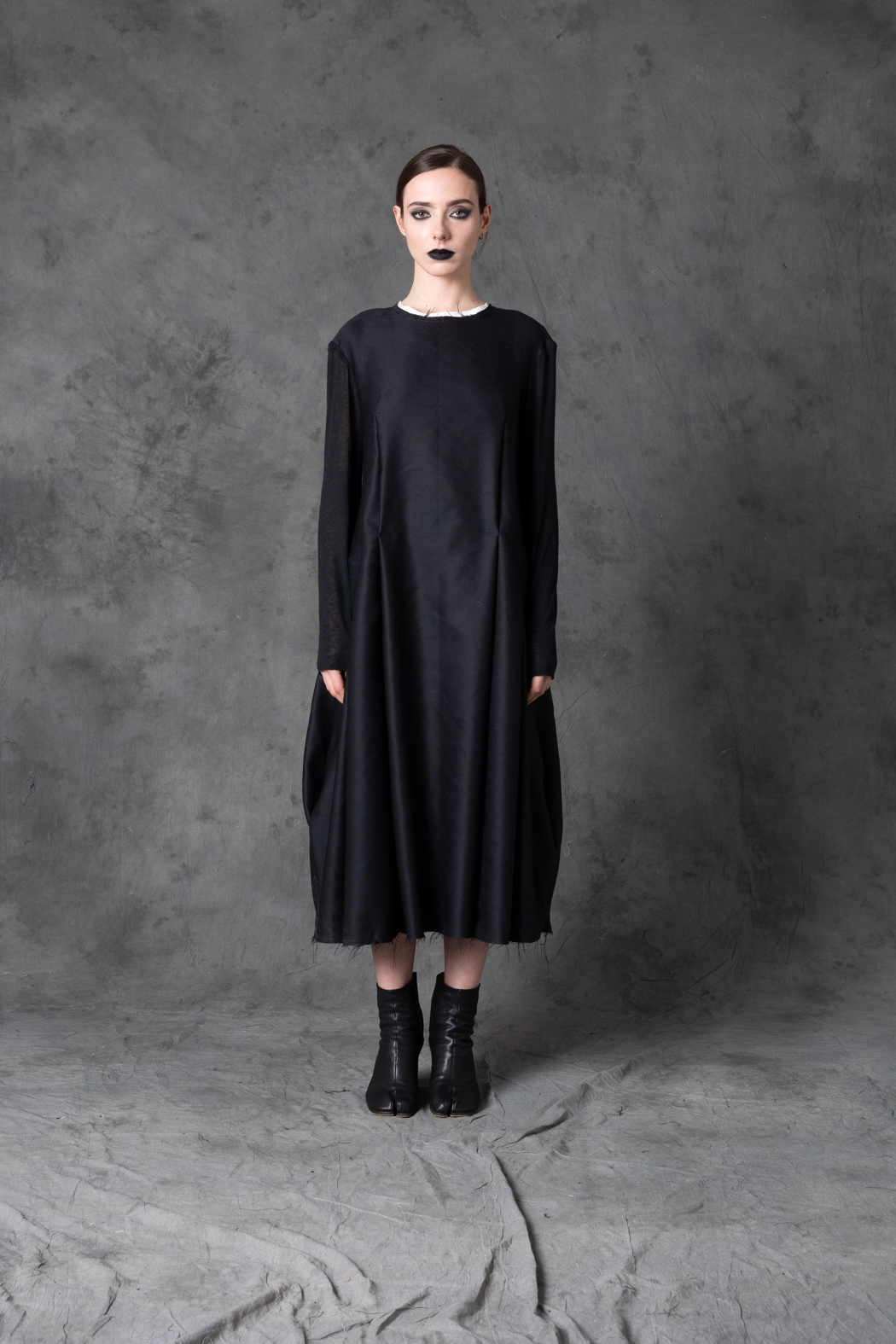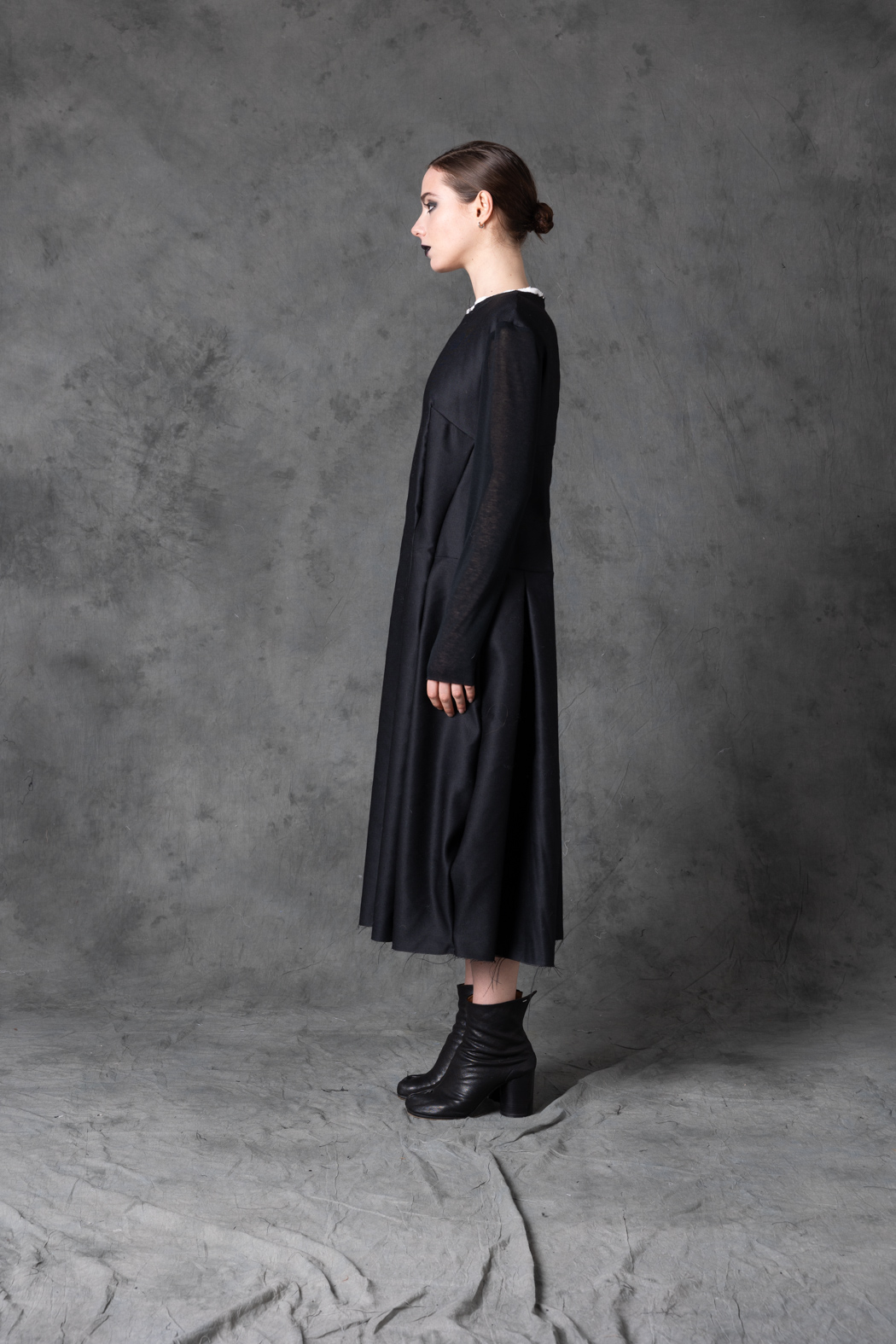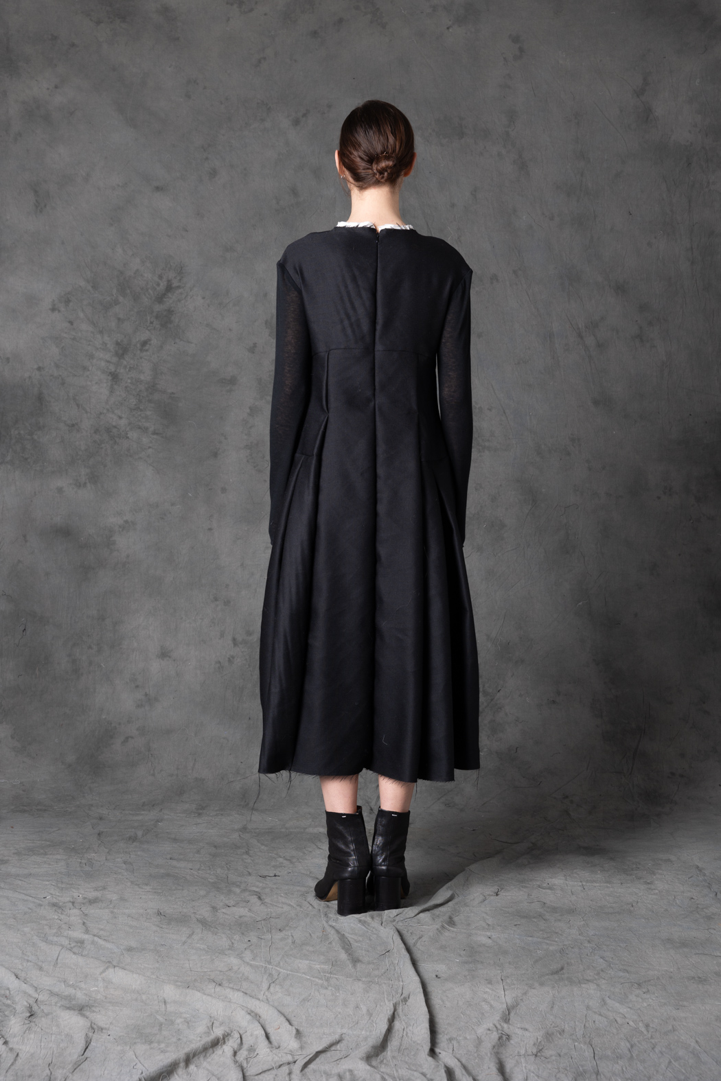 A wool–cashmere dress with a soft, rounded line and structured body. Its gentle volume and textured surface create a poetic, doll-like presence with refined depth.