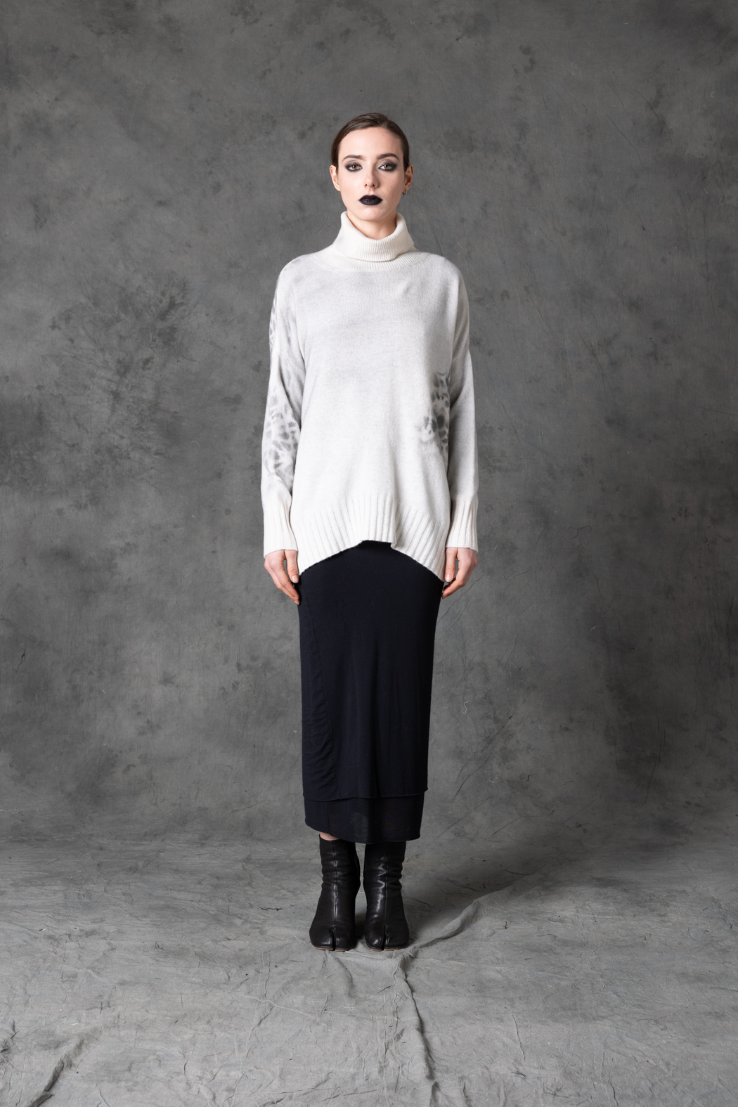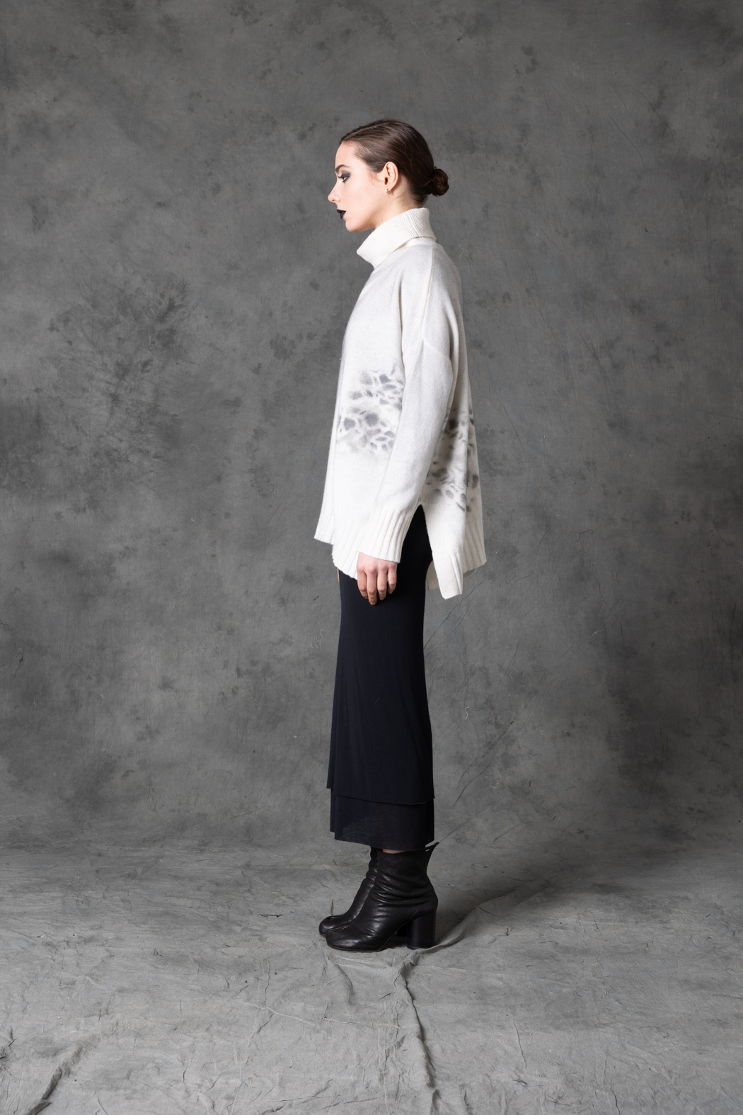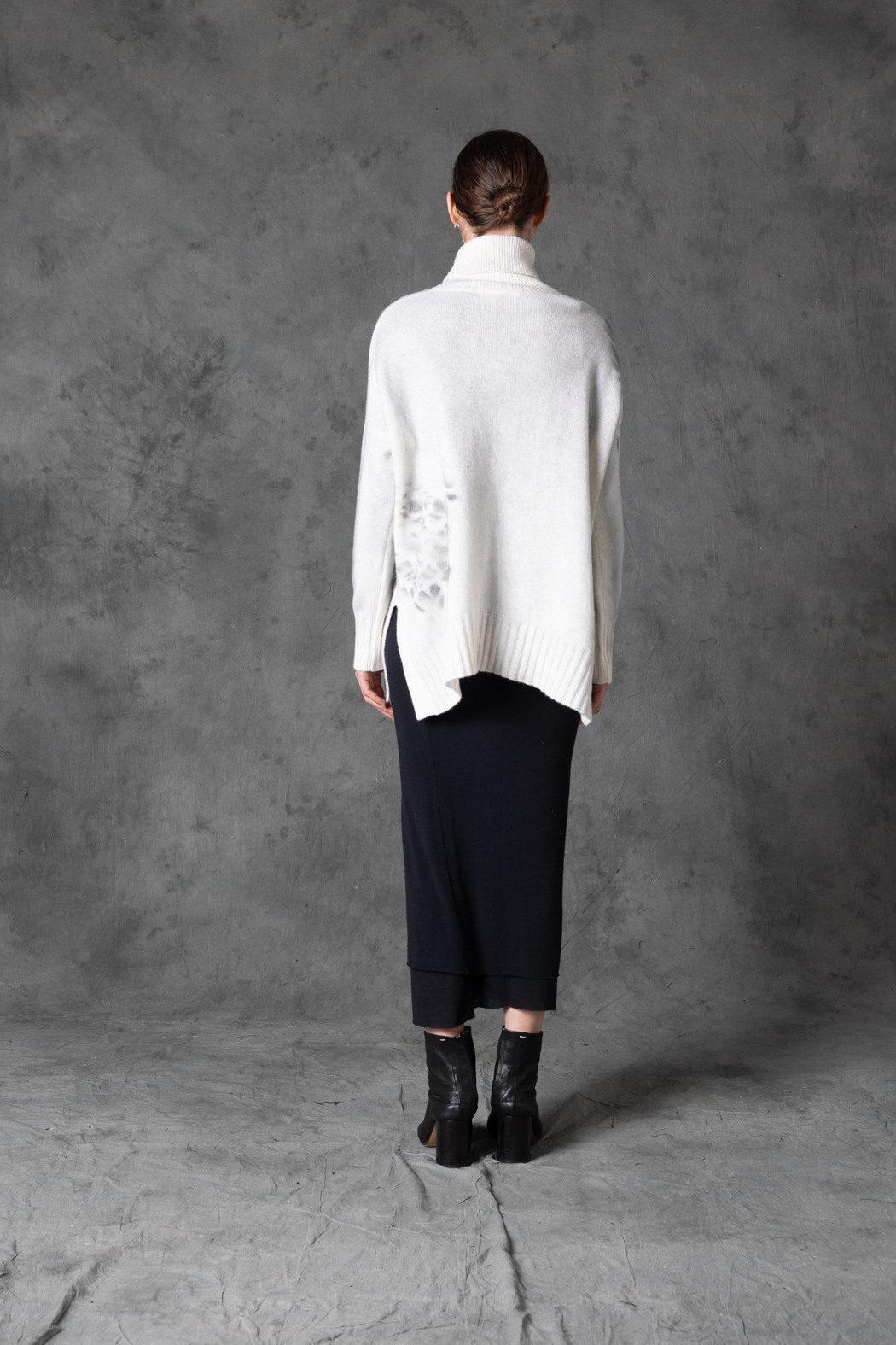 A pure wool white sweater featuring delicate sleeve graphics. Minimal, bright, and quietly artistic, it adds a refined contrast to darker ensembles.