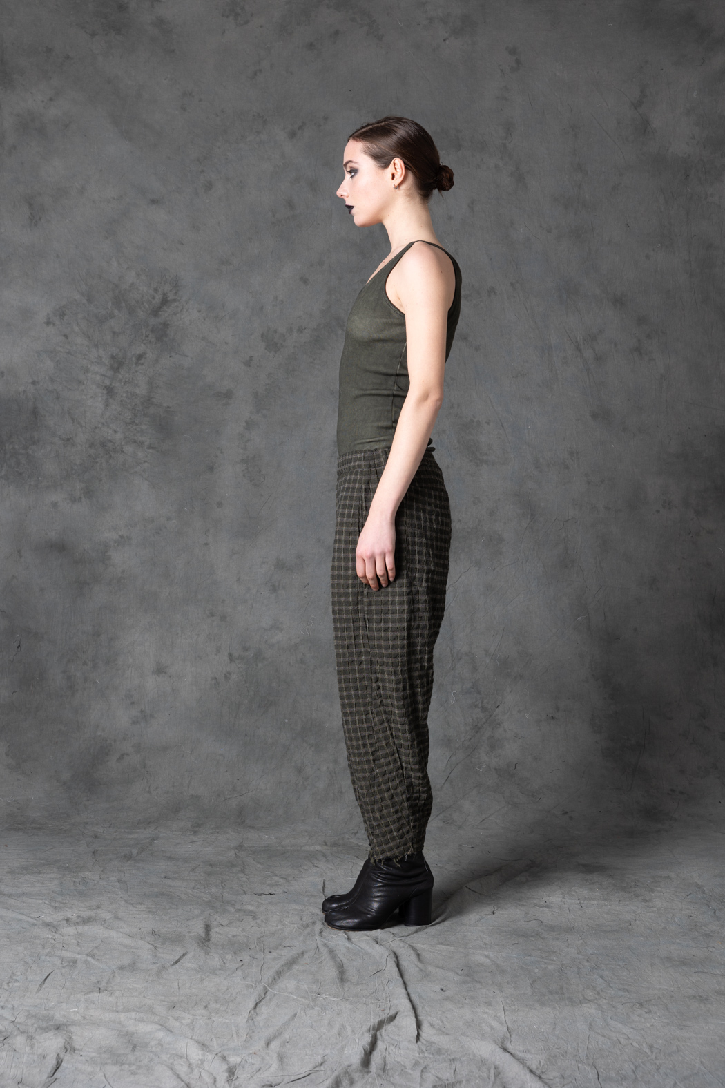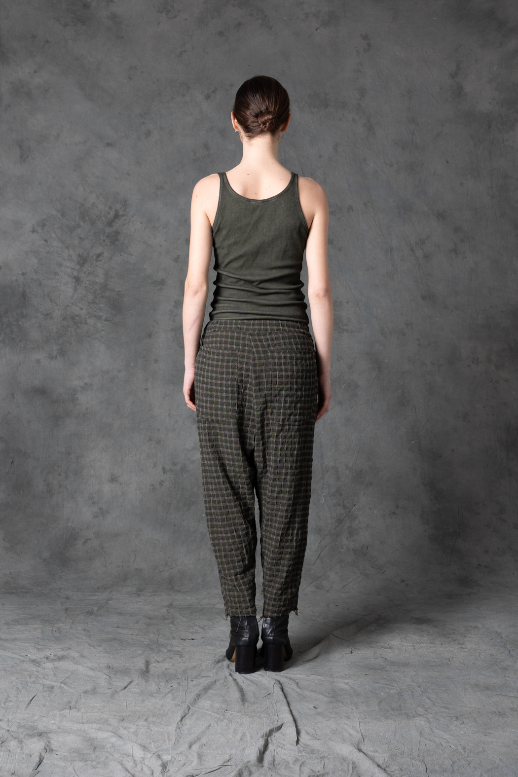 Wool-viscose check trousers with a tailored yet relaxed fit. The subtle pattern and clean lines create a modern, understated avant-garde look.