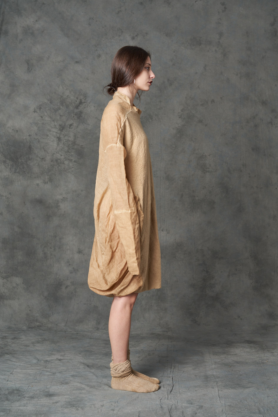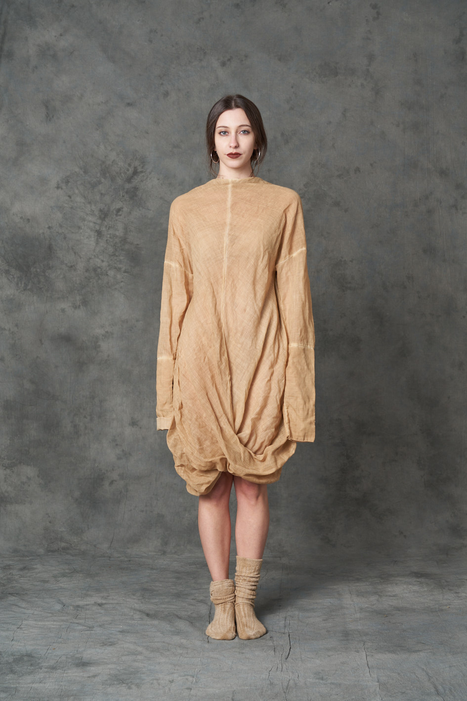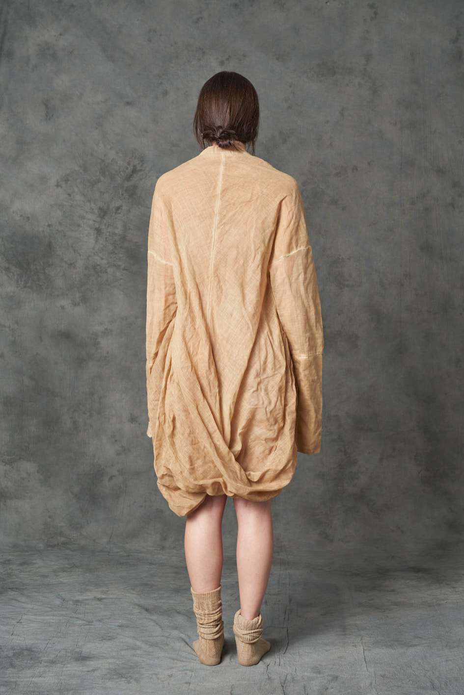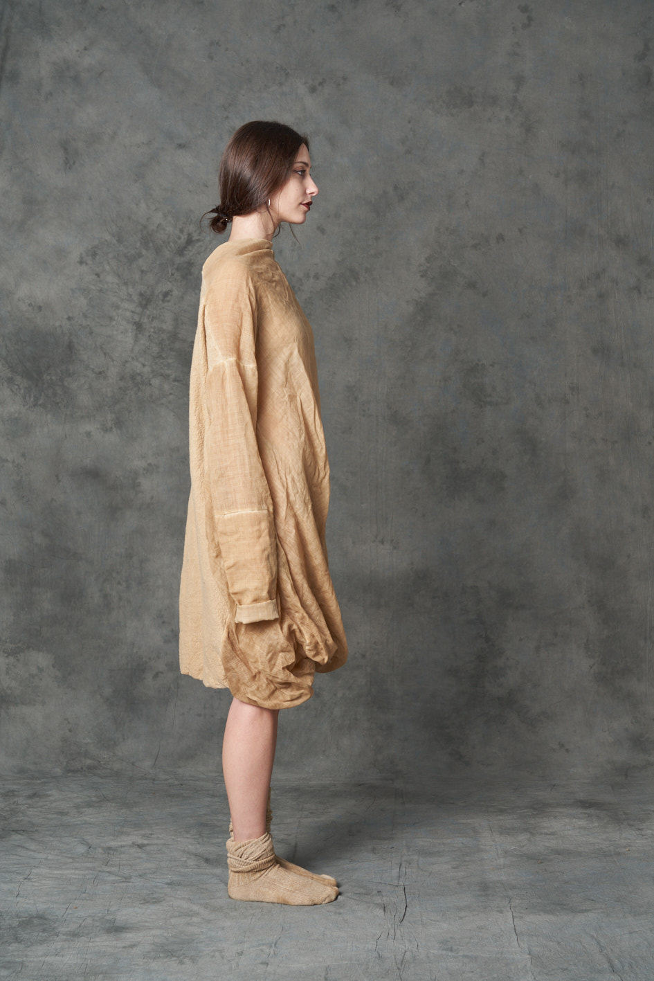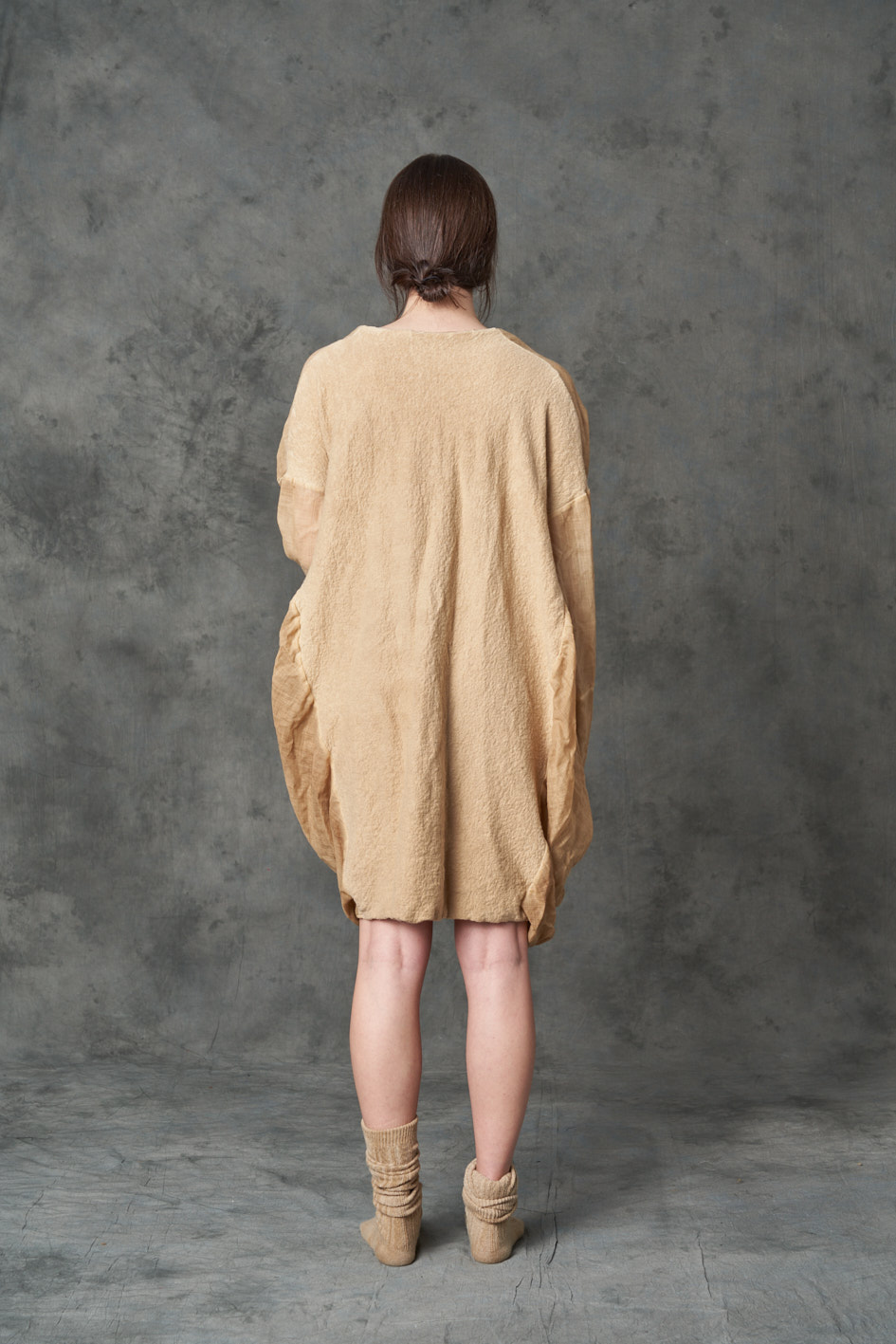 Two fabric dress: The back is a materic warm wool , the sleeves and the front are made in wool gauze. The dress is dyed light coffee COMPOSITION: 100%Wo + 100%WO