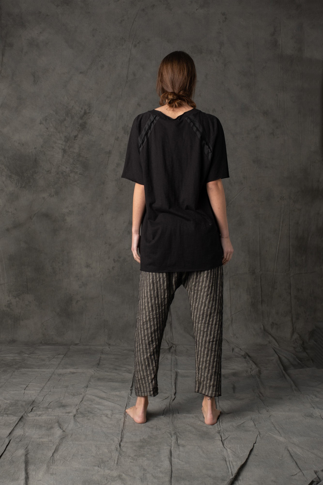 Low crotch striped pant , regular fit made in a precious overdyed fabric. The band is doubled inside with black with 100% linen gauze.