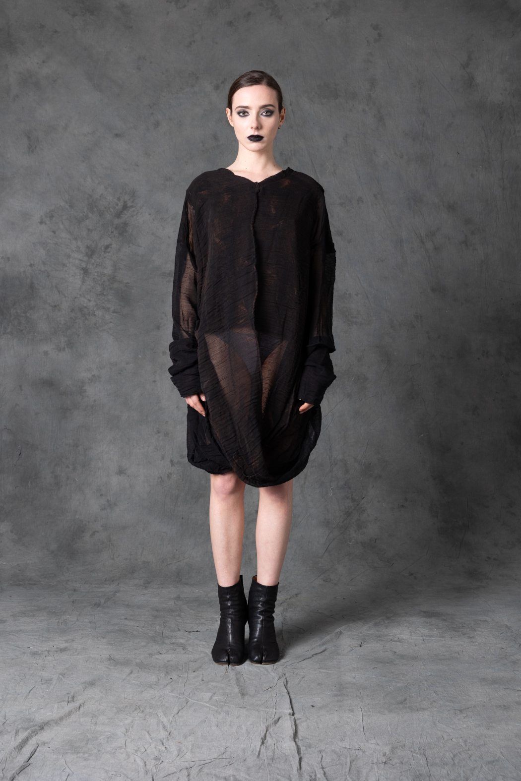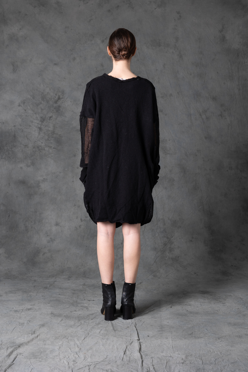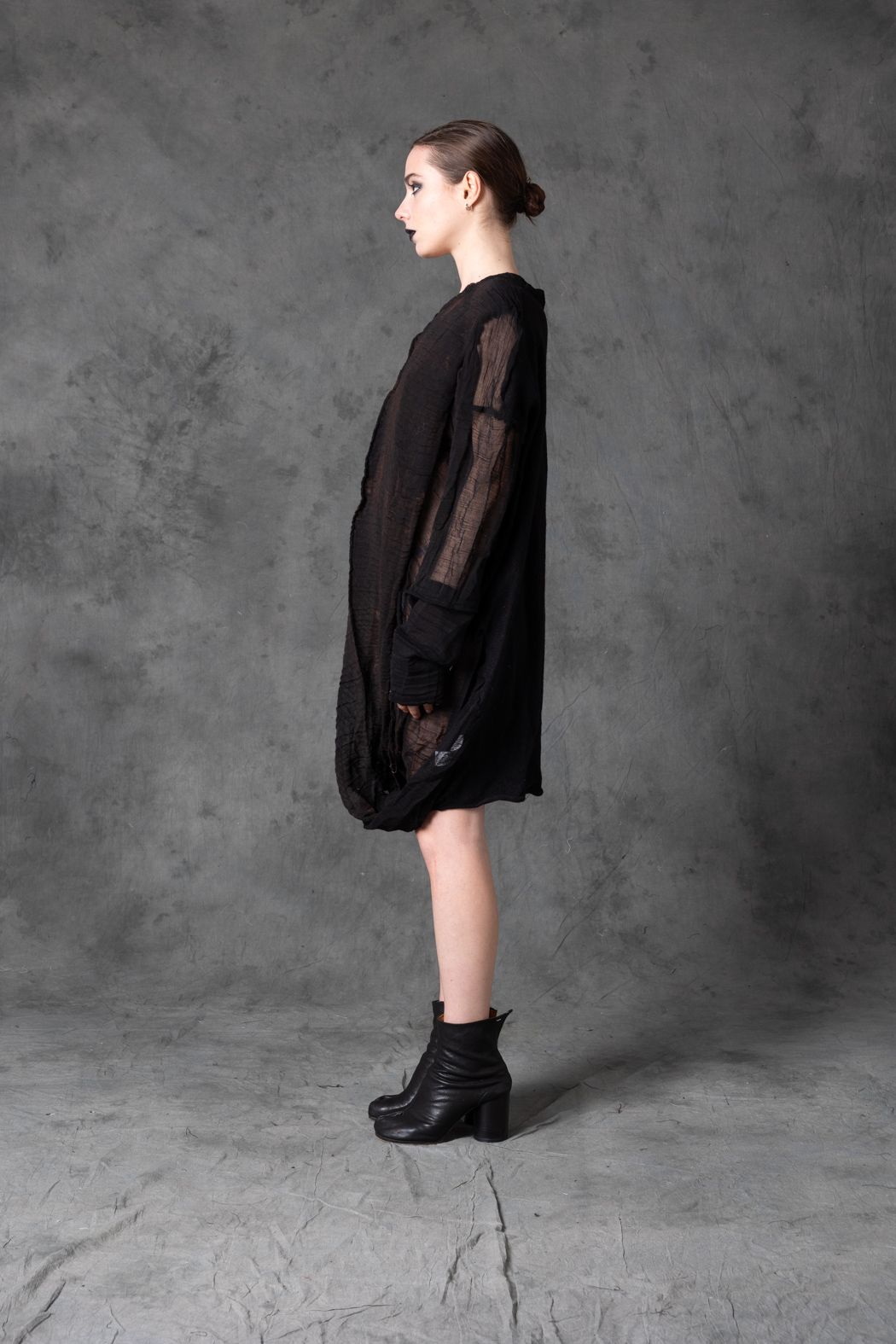 A double-wool dress featuring a structured, sculptural flow. Minimal yet commanding, it carries a quiet theatrical presence suited for refined avant-garde styling.