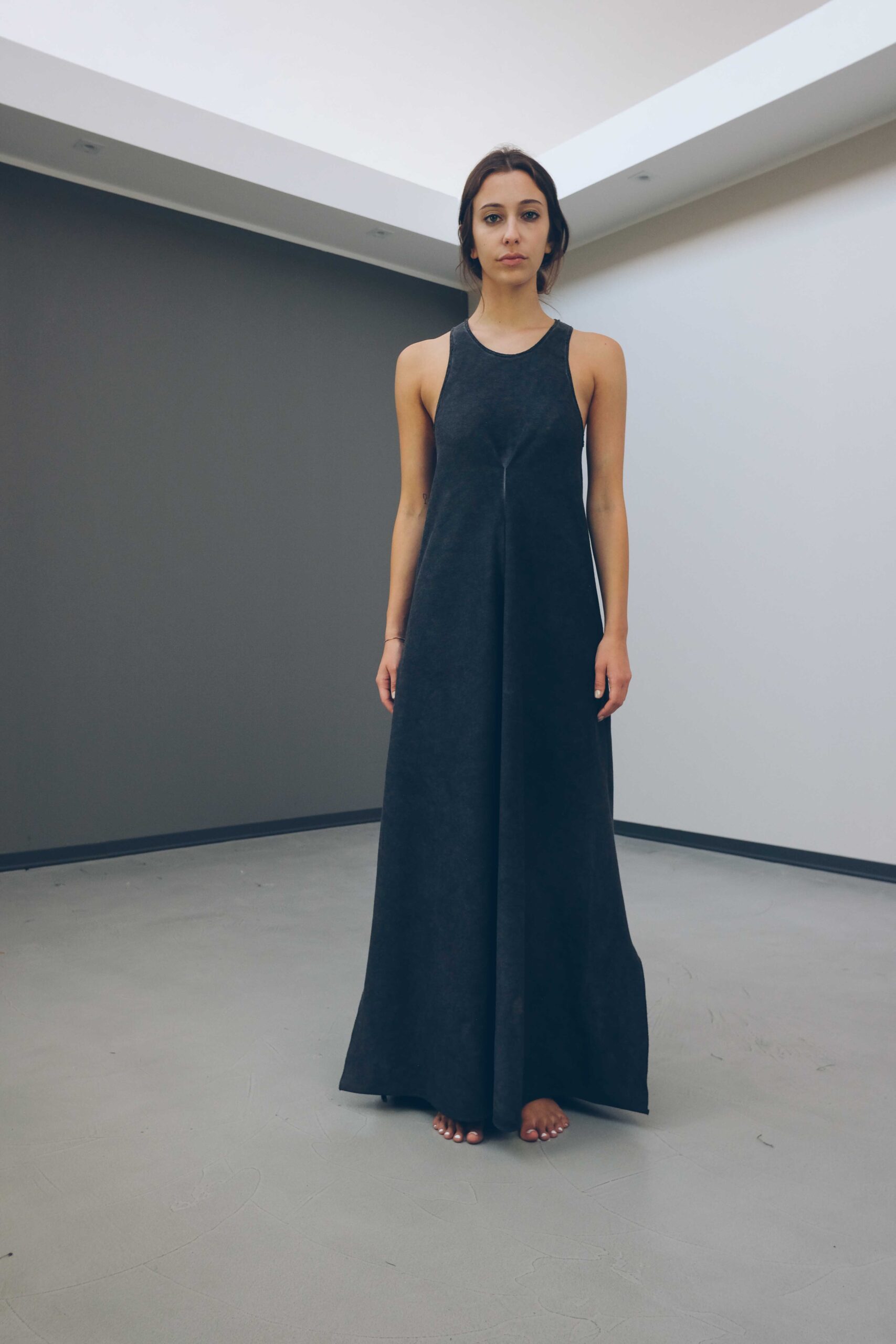 American neckline long dyed fleece dress, neck and holes are covered with cotton muslin. Folded detail in the front and two splits in the sides.
