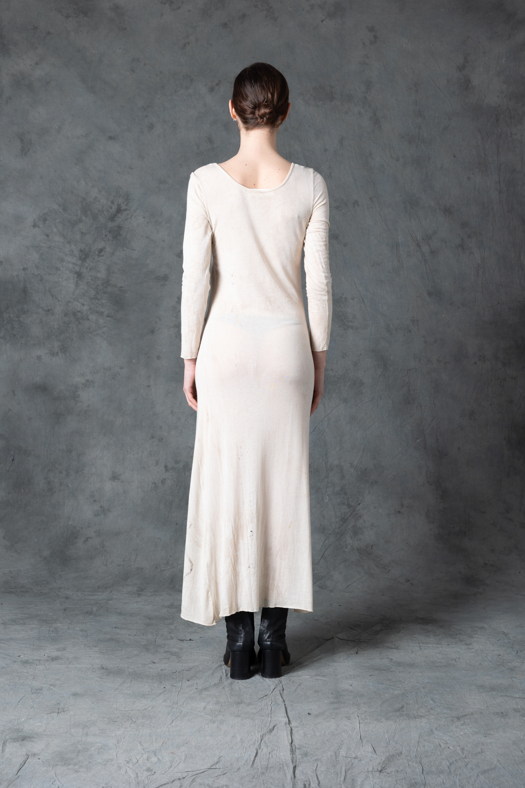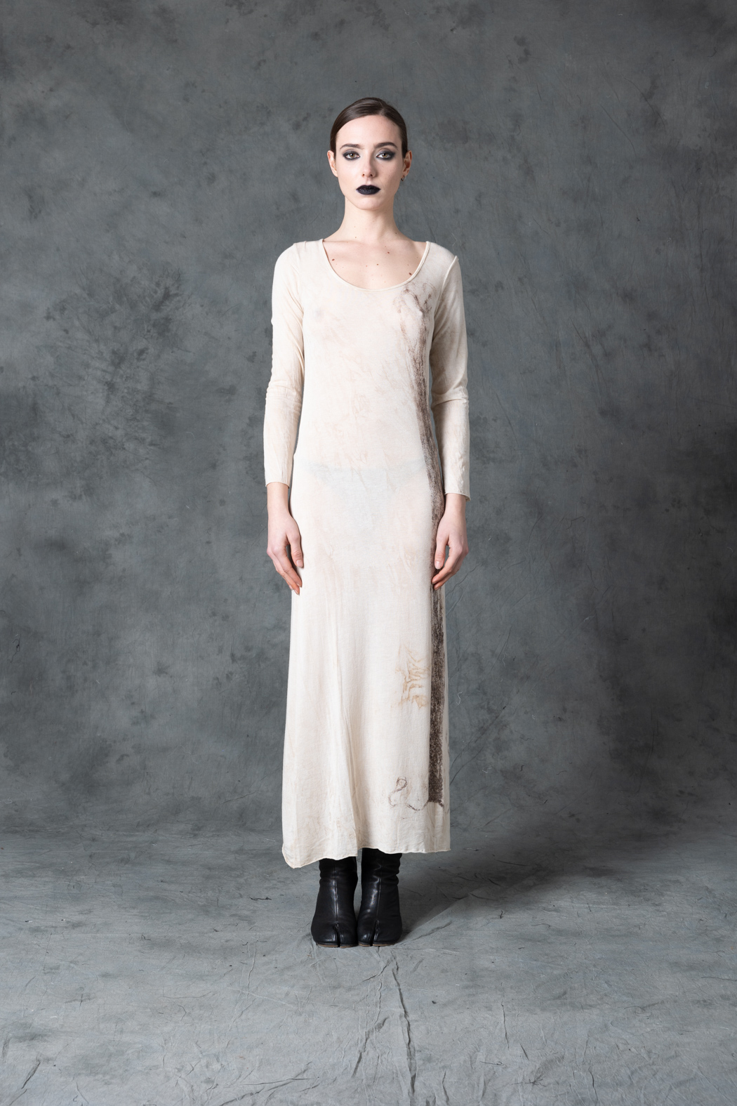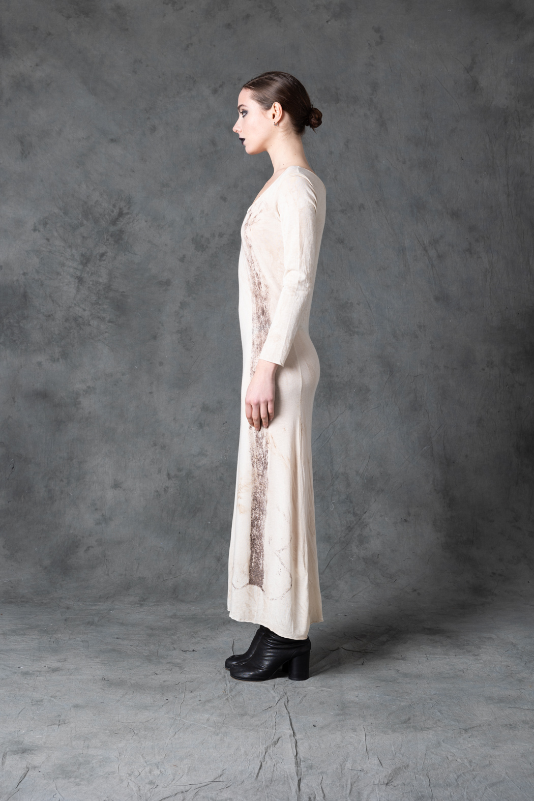 A long slip-style tubo dress crafted in soft wool–silk and modal. Its clean cylindrical silhouette is elevated by hand-painted brush details, adding an artistic, intimate touch to a minimal form.