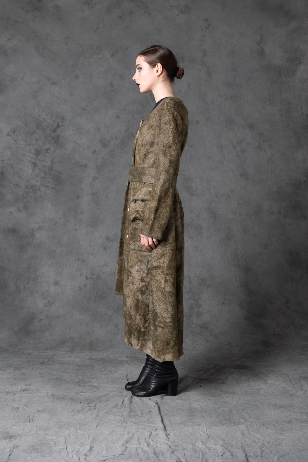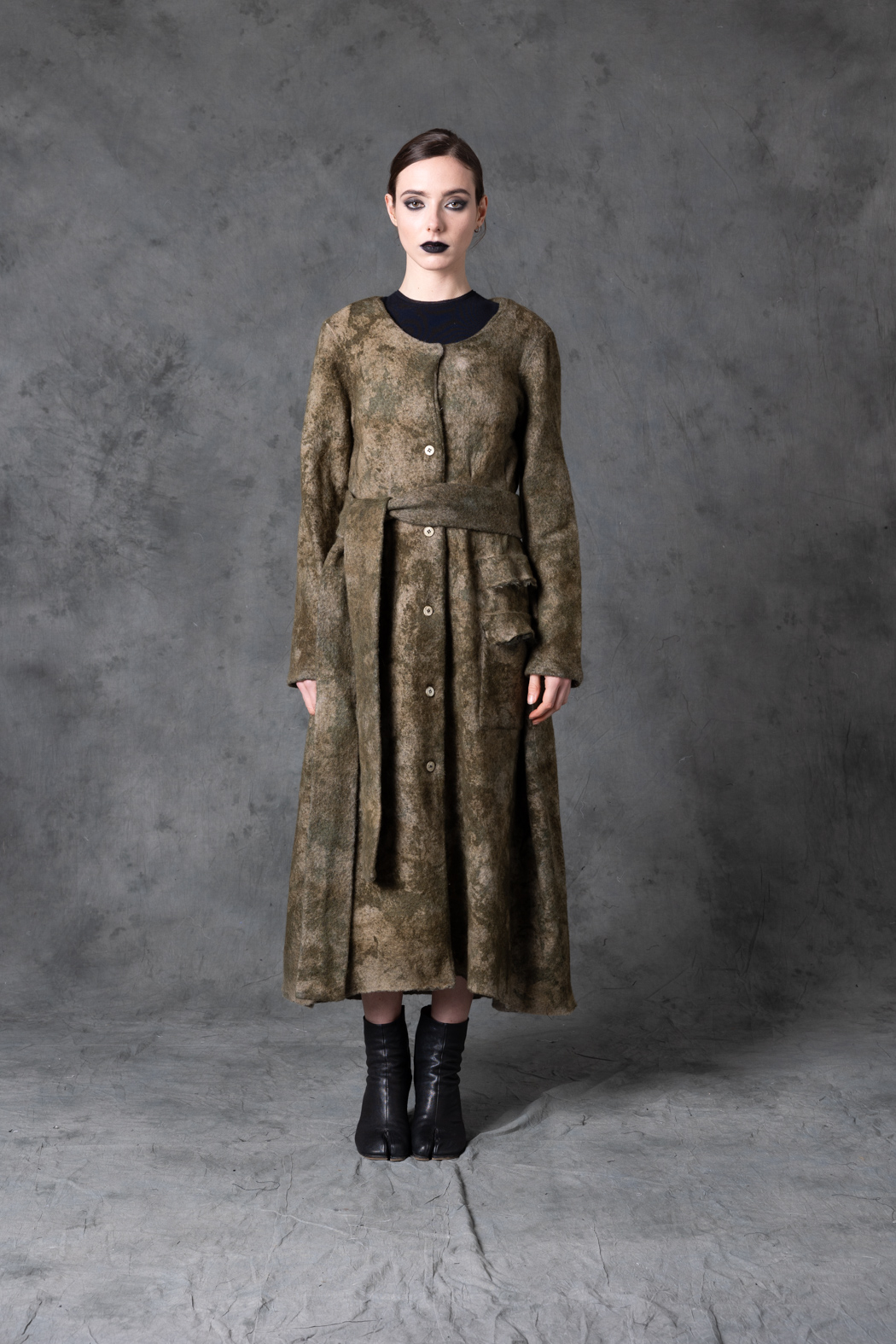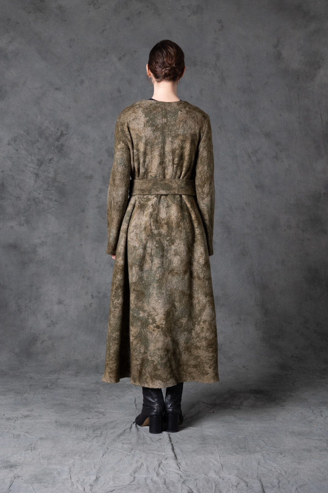 A long, fluid coat featuring an artistic camouflage pattern. Earthy tones and a belted waist create a sense of organic drama, blending nature and experimentation.