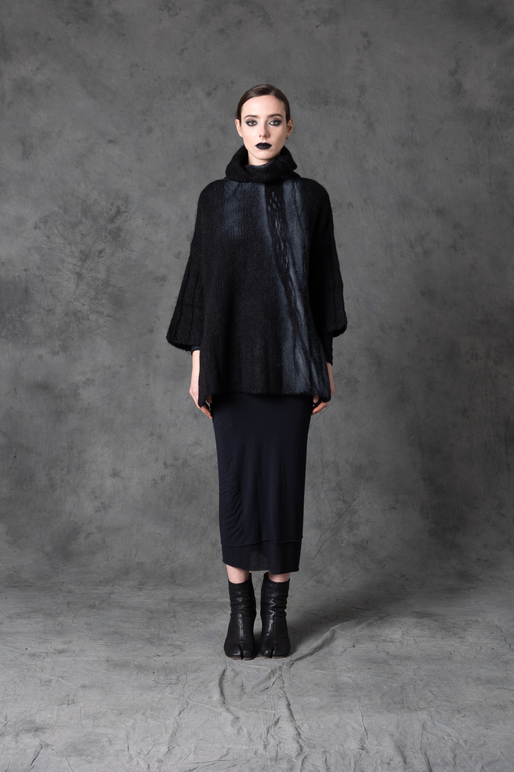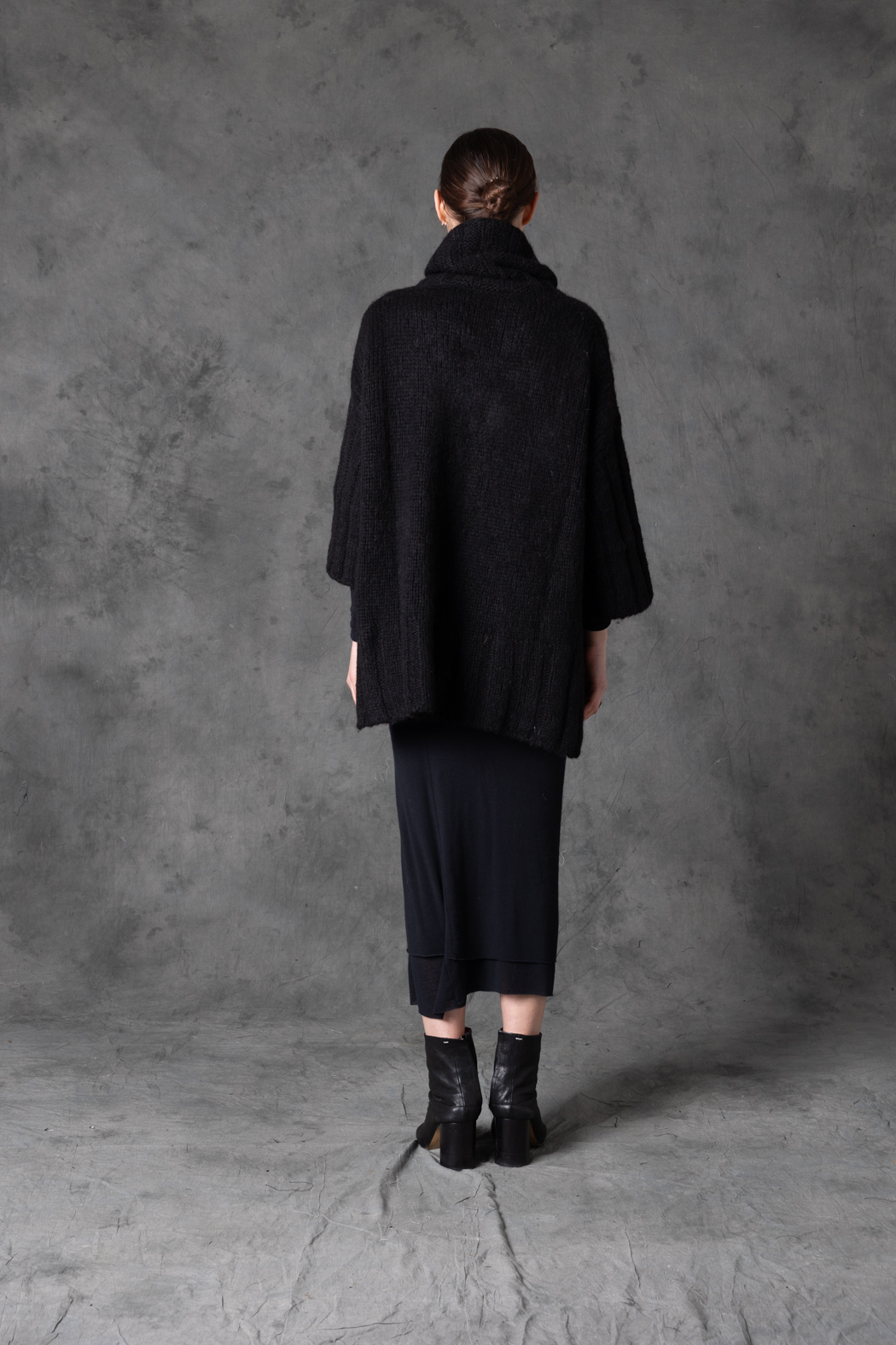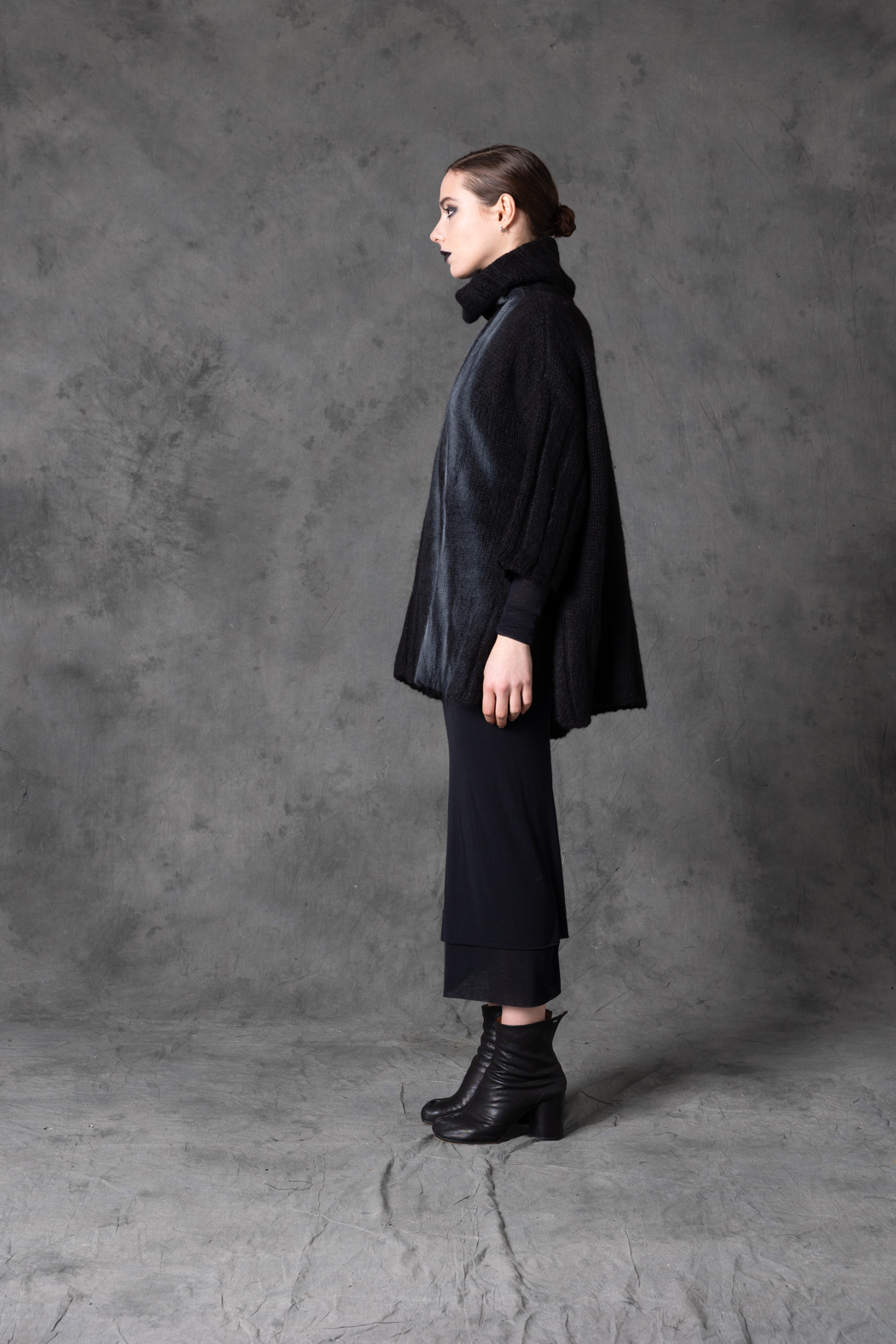 A soft black sweater in baby alpaca and wool. Its rich texture and minimal shape create an enveloping, shadow-like presence—simple yet mysteriously expressive.