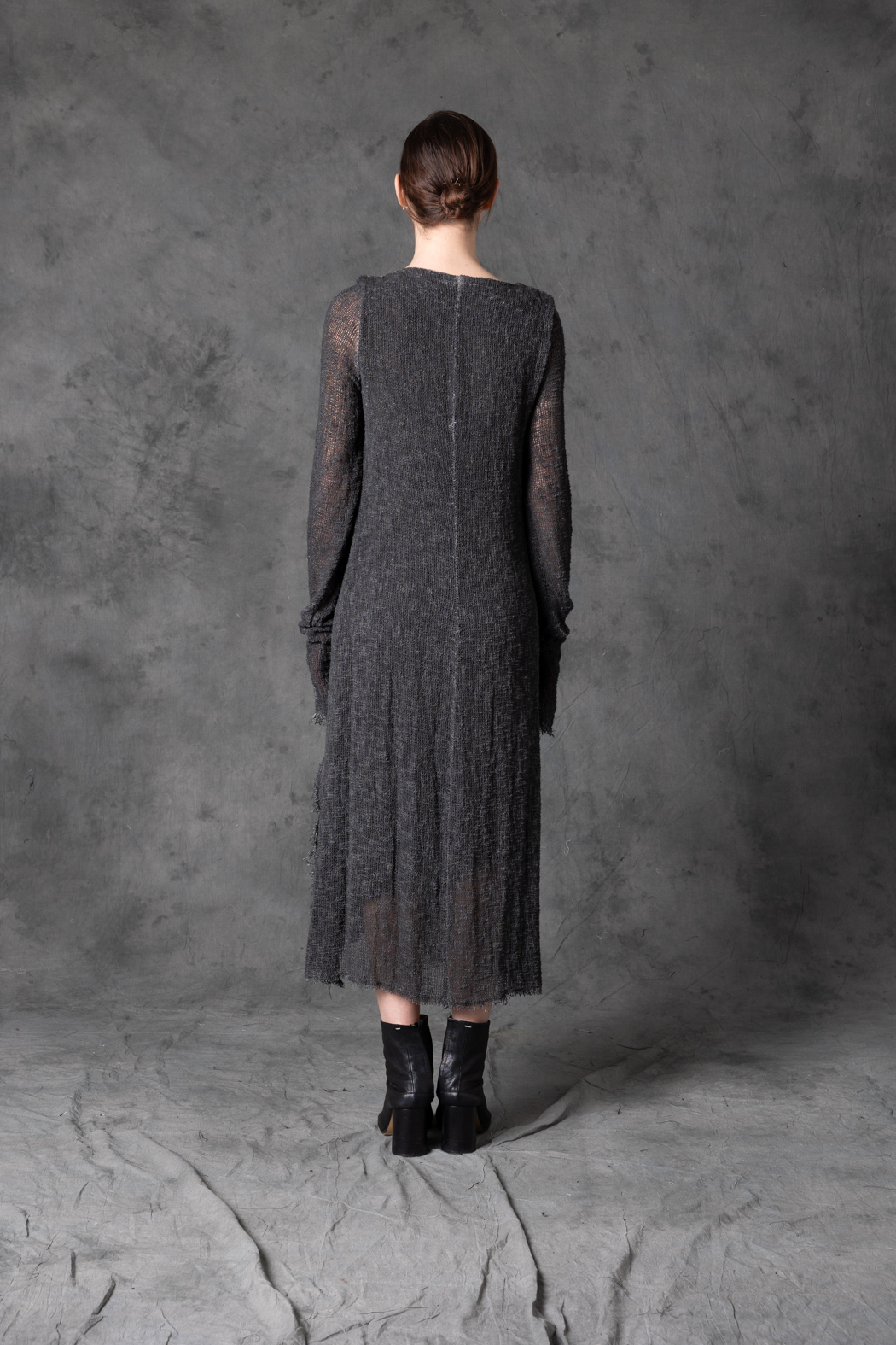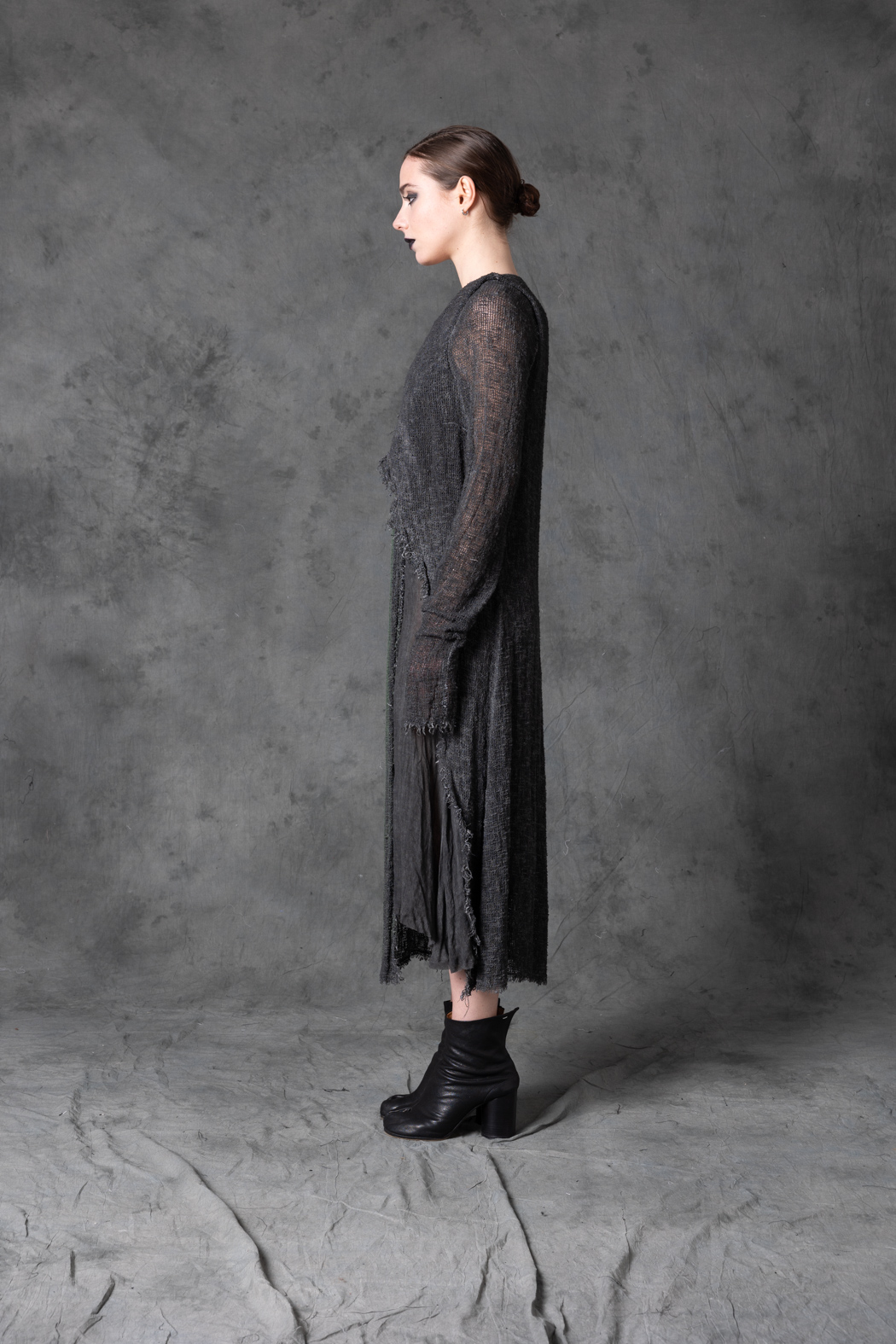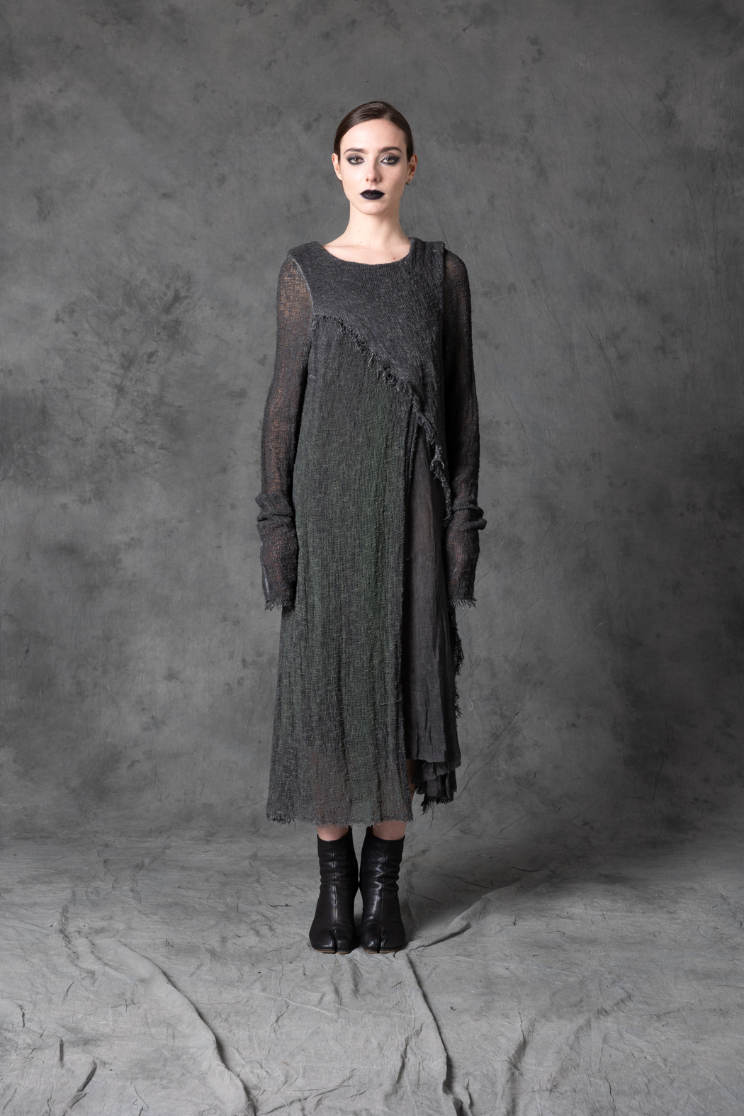 A layered dress featuring a net structure over painted green wool. Organic, textured, and visually charged, it creates a dynamic interplay between opacity and transparency.