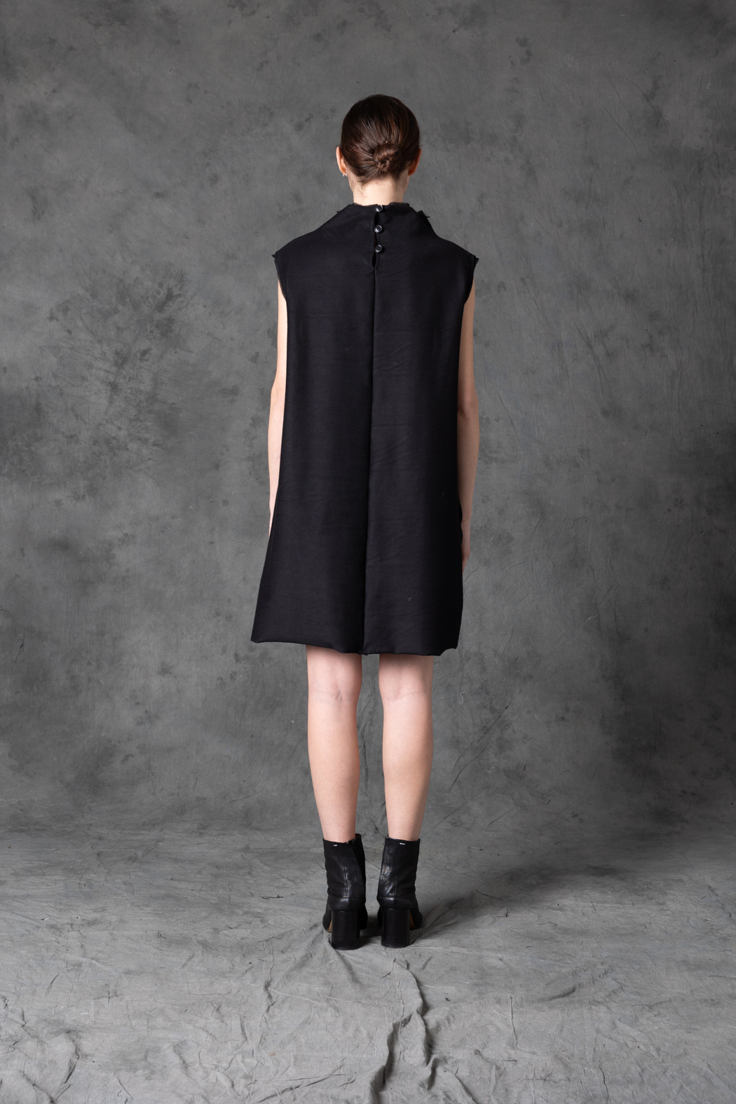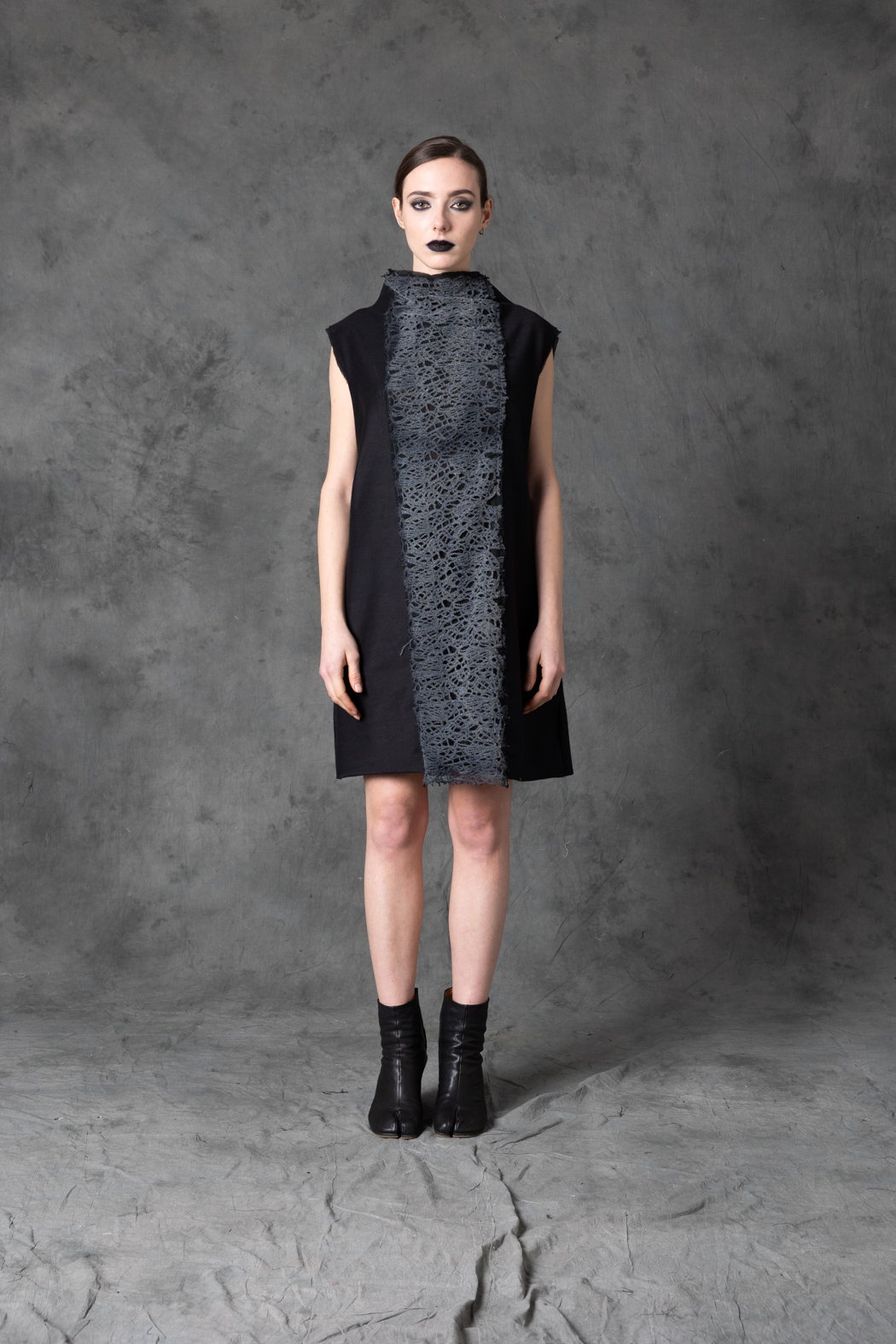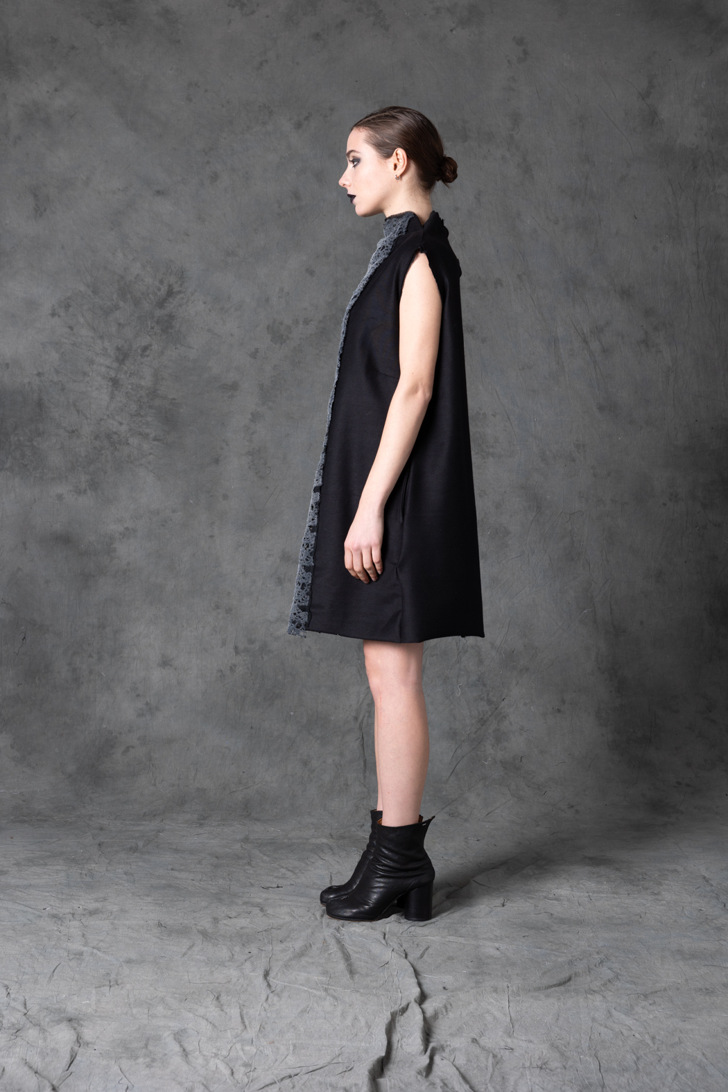 A delicate tunic featuring painted lace and a sculptural bow detail. Light, artistic, and fluid, it merges romantic texture with a modern avant-garde silhouette.