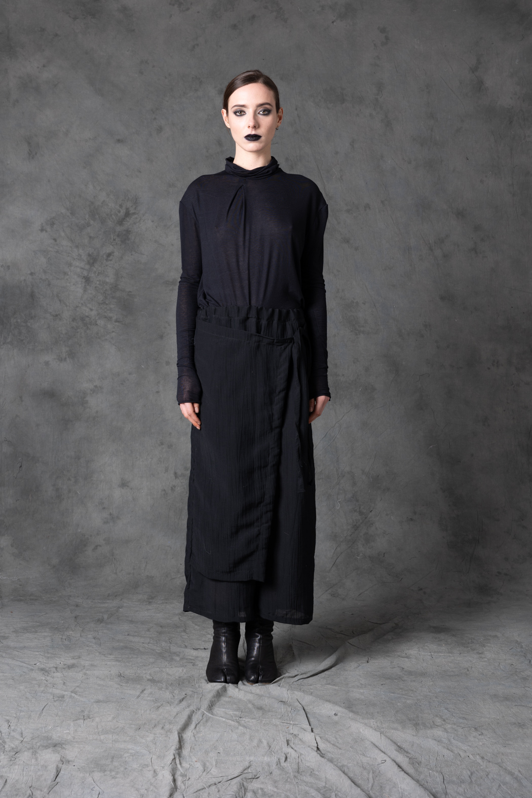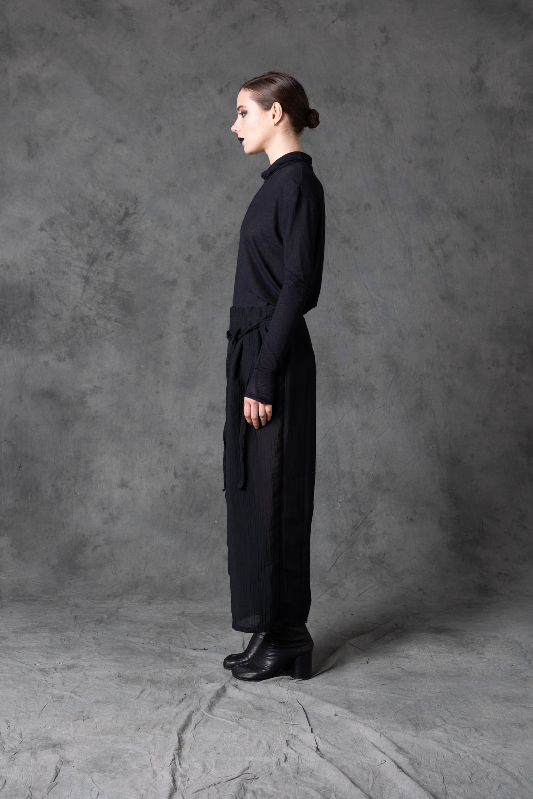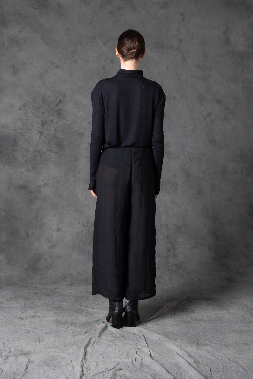 A wool–silk pant with a fluid drape and elongated line. Lightweight yet structured, designed for elegant movement and experimental styling.