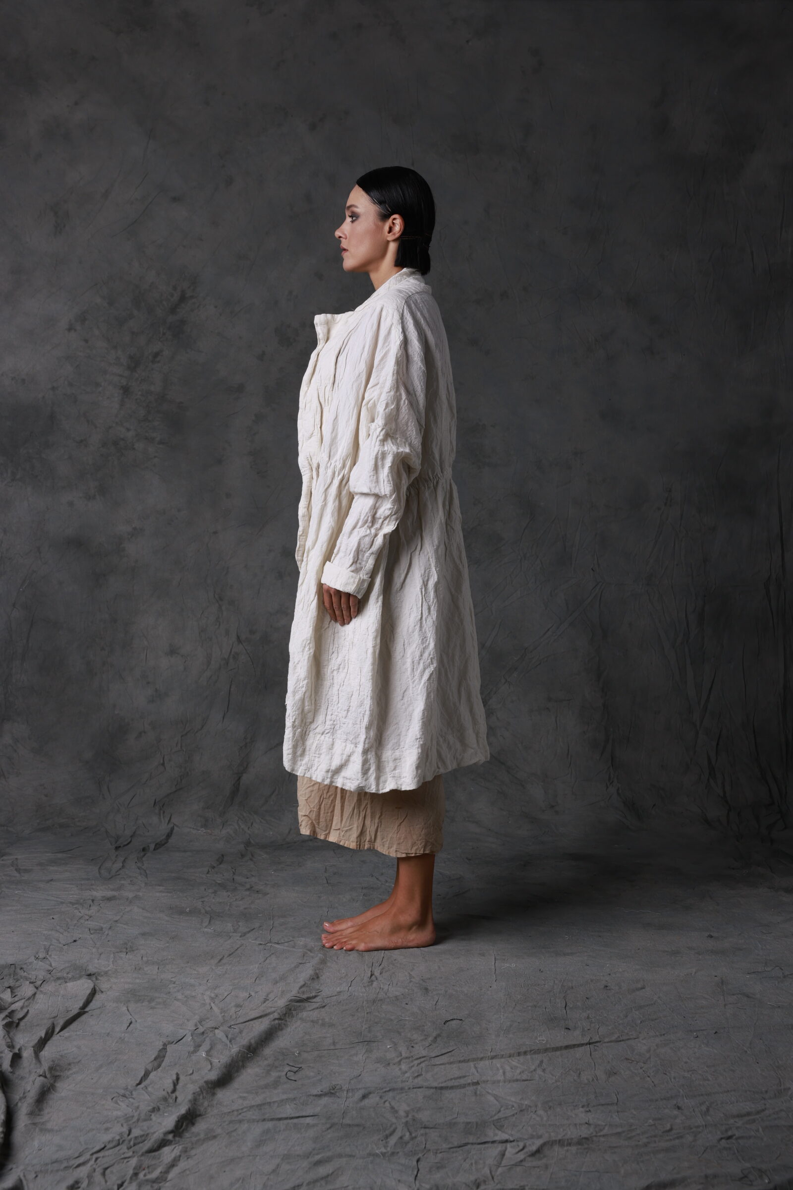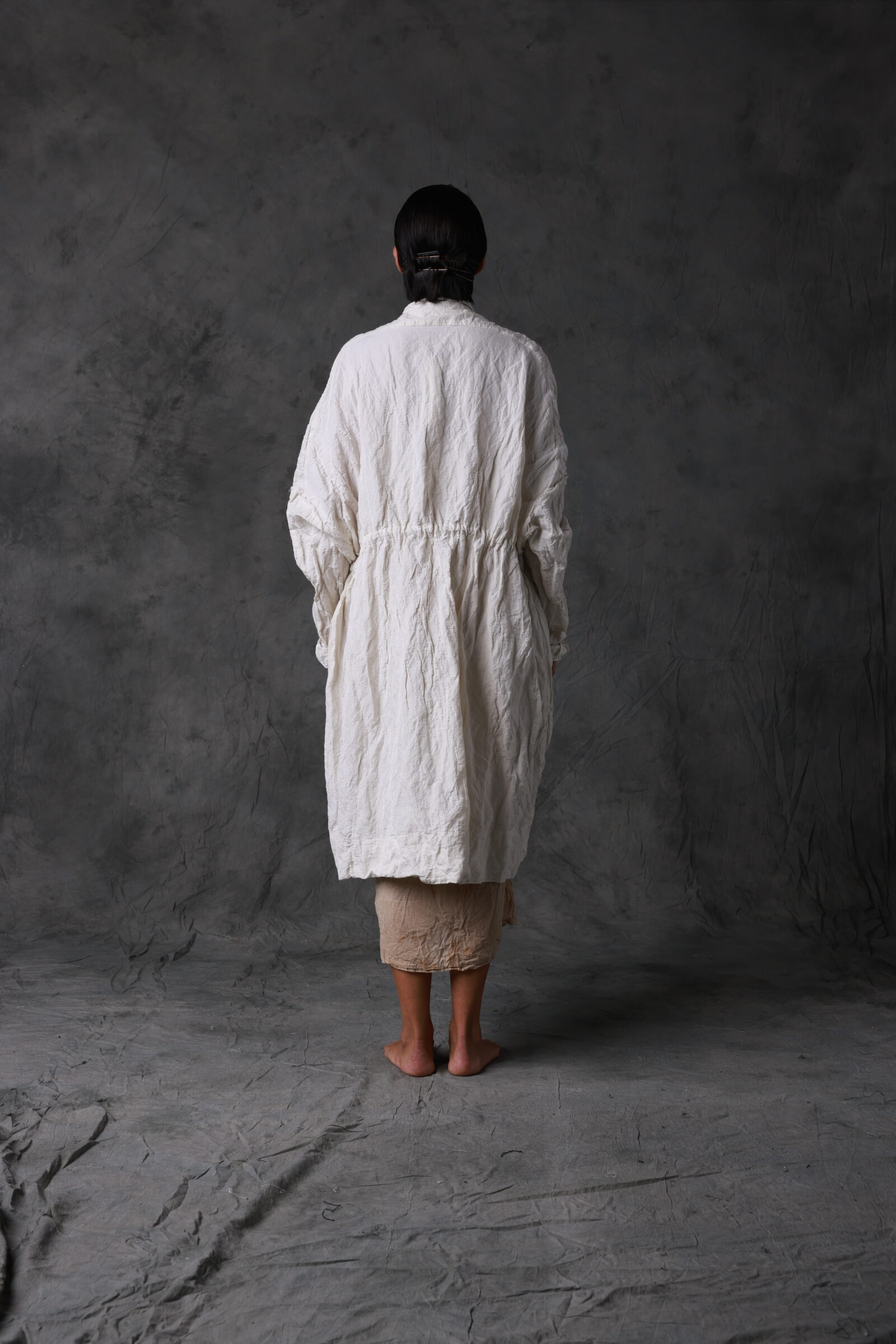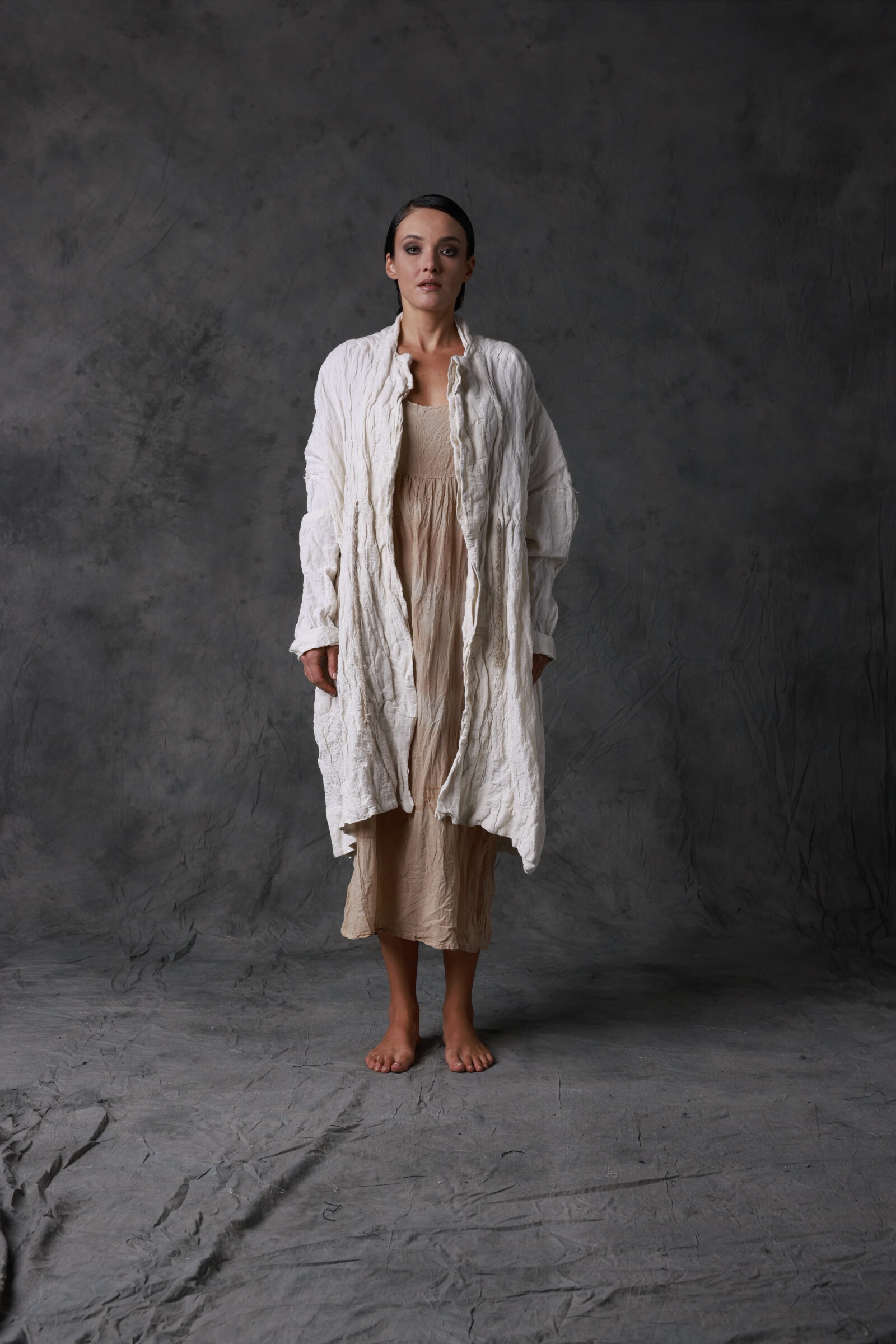 Minimal and sensual, Sage Coat embodies the purity of form and material. The delicate texture of silk and hemp follows the lines of the body with refined restraint—a staple of quiet luxury.