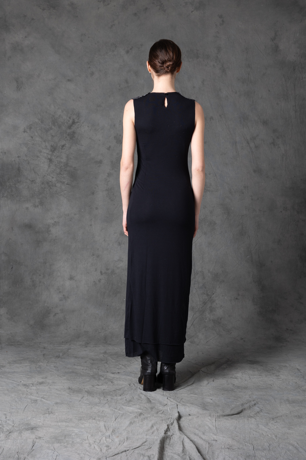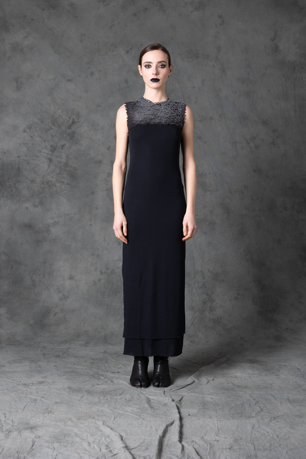 A layered lace dress blending modal, wool-silk, and wool. Dark, delicate, and atmospheric, it creates a shadowy, sculptural femininity.