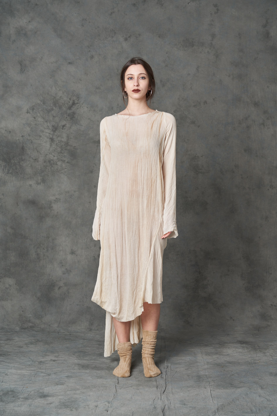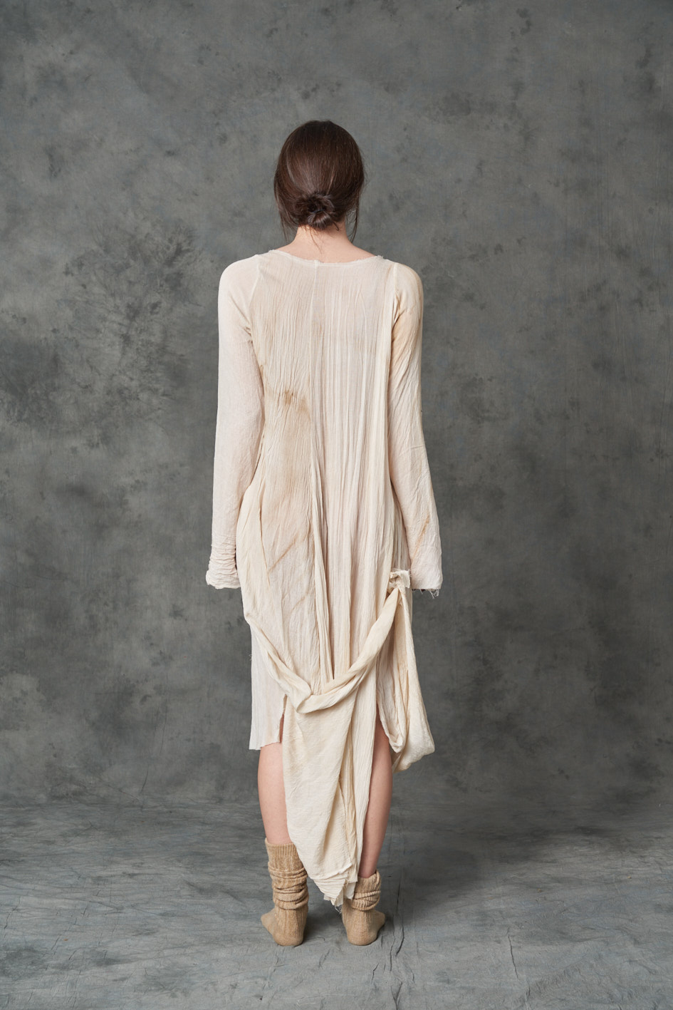 Feminine Long Dress made in wool gauze badly dyed with coffee. Asymmetrical lenght , the front is shorter than the back. The dress could be left loose or closed by buttons on the side