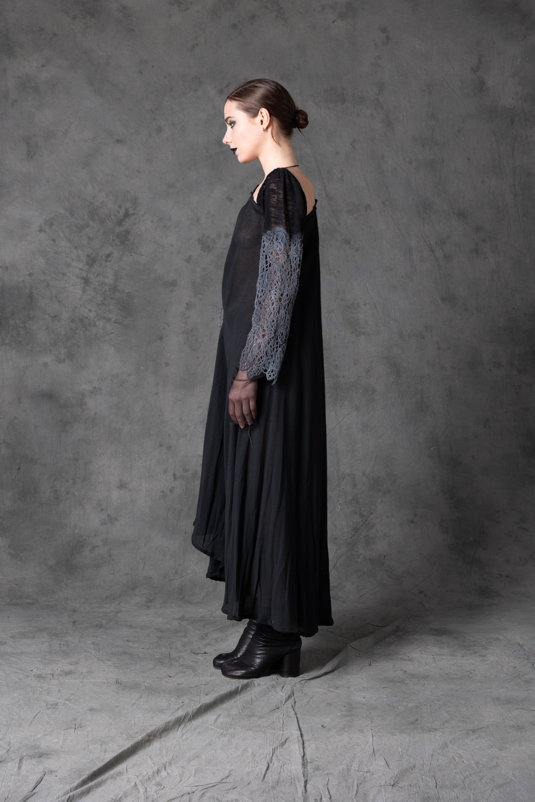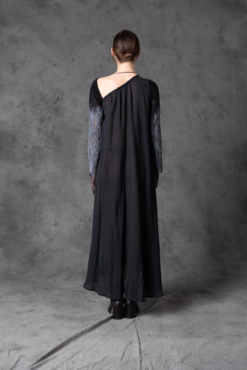 A multi-layered wool and silk dress with fluid vertical movement. Its elongated, ethereal silhouette captures a haunting elegance reminiscent of deep-sea sirens.