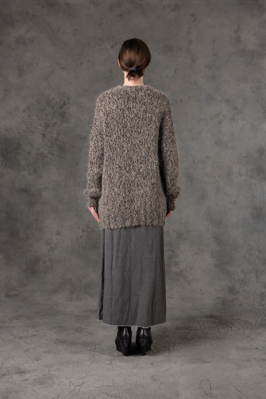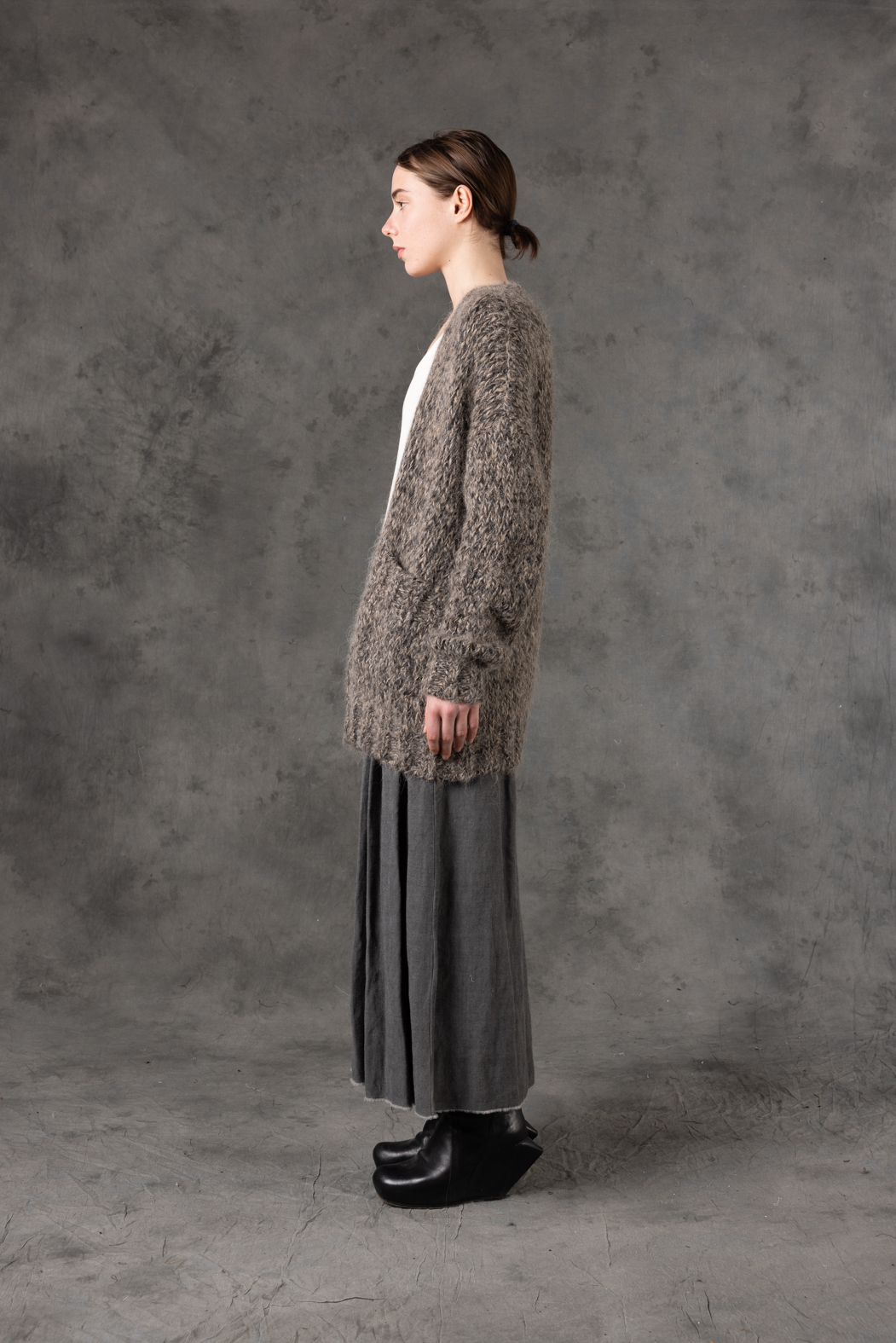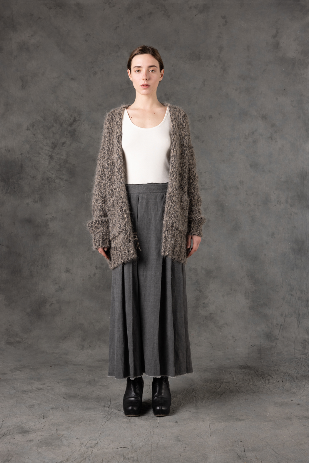 A tribute to raw beauty and nostalgia. The Stevie cardigan flows freely, with the softness of alpaca yarn and the strength of an open spirit. The silhouette is casual yet intentional—worn loose, wrapped, or layered—always speaking of individuality and movement.