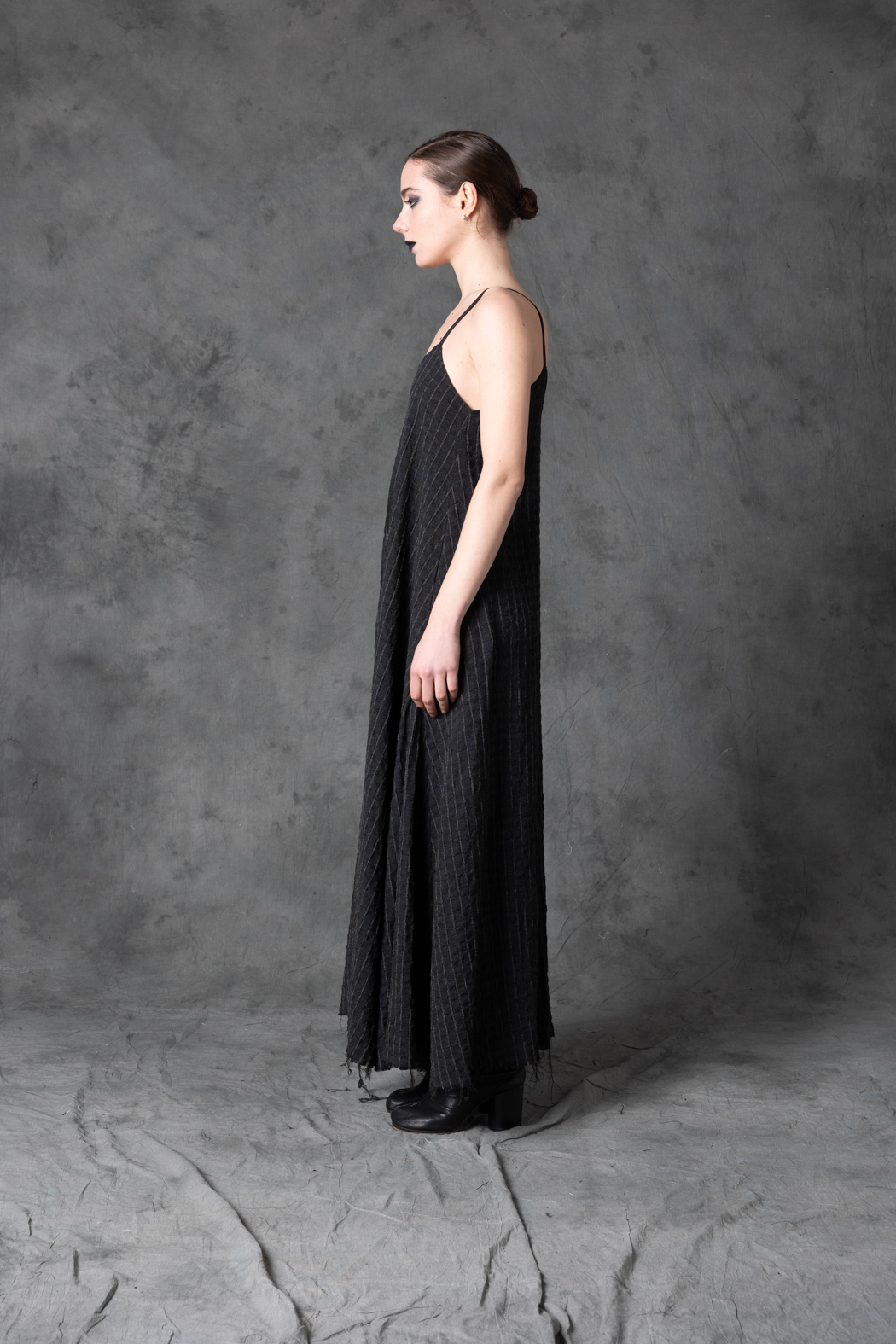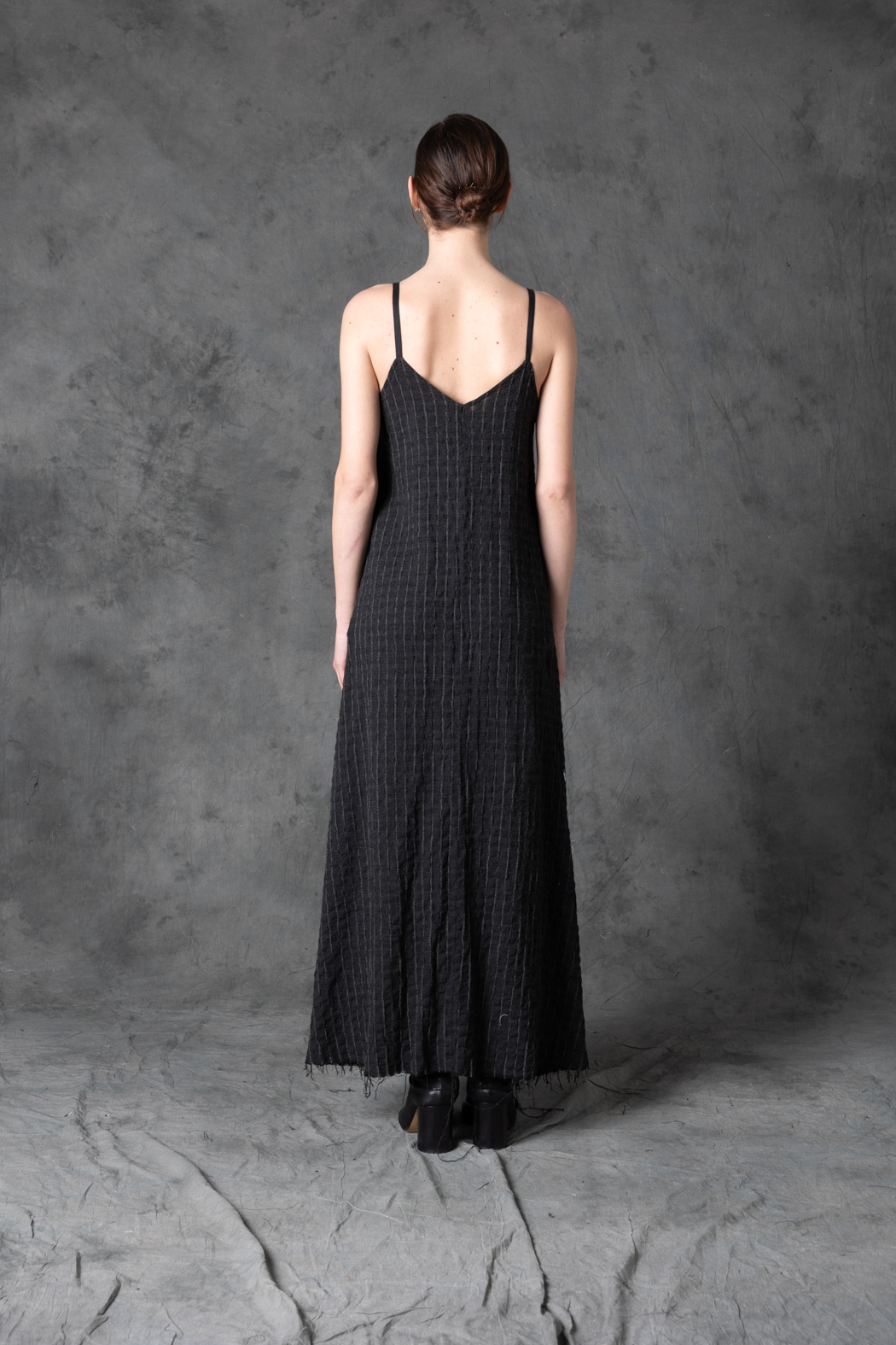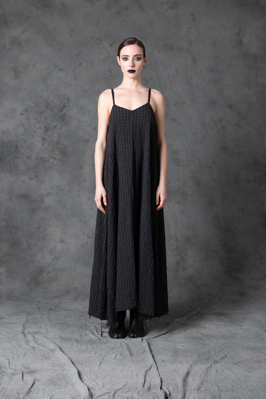 A monochrome striped dress with a clean vertical flow. Its graphic rhythm and elongated silhouette evoke a futuristic, celestial elegance.