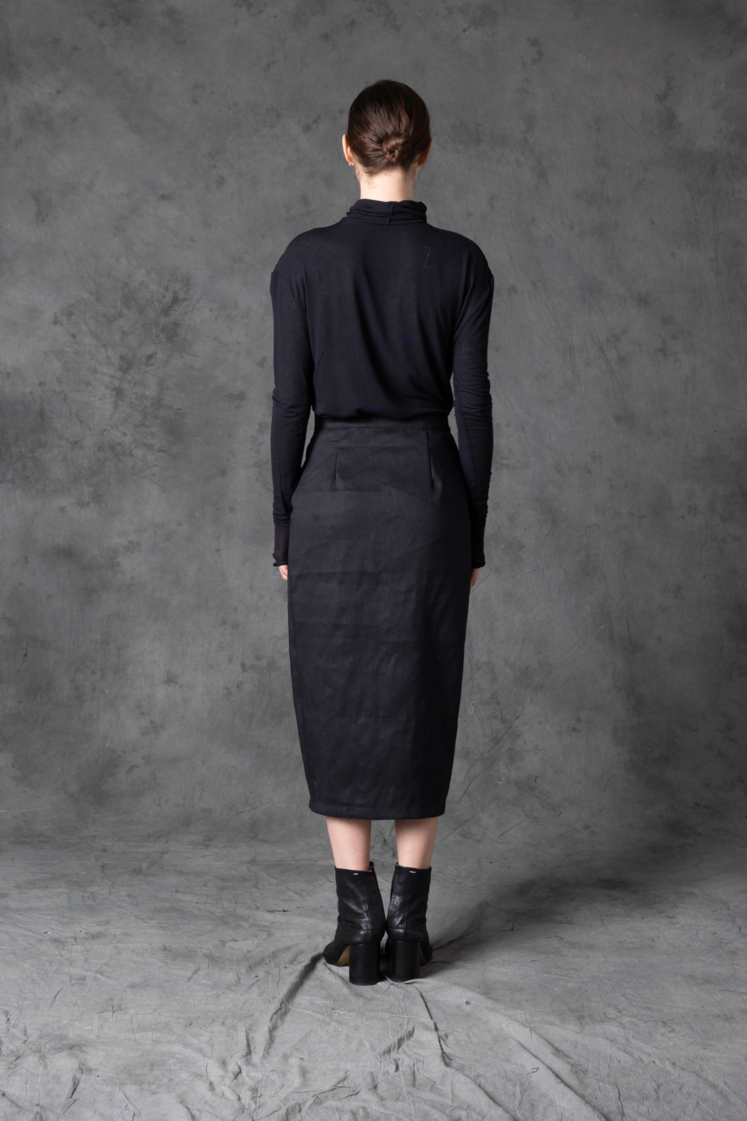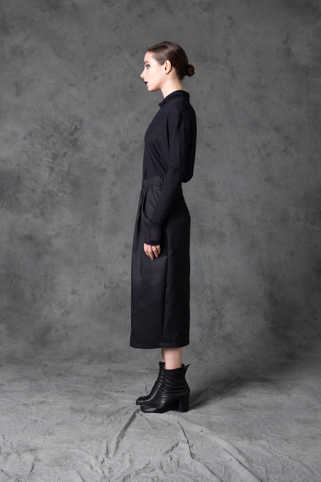 A wool–hemp blend skirt with a minimal, elongated cut. Natural texture meets refined structure, creating a grounded yet contemporary silhouette.