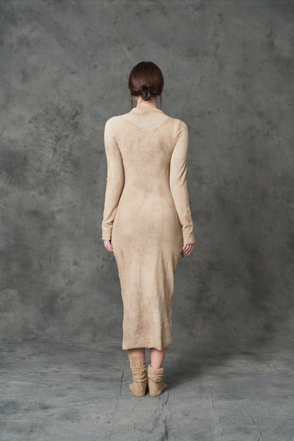 Tight-fitting and enveloping medium lenght dress made in a softly and warm cotton and wool fabric. This dress is badly dyed coffee.