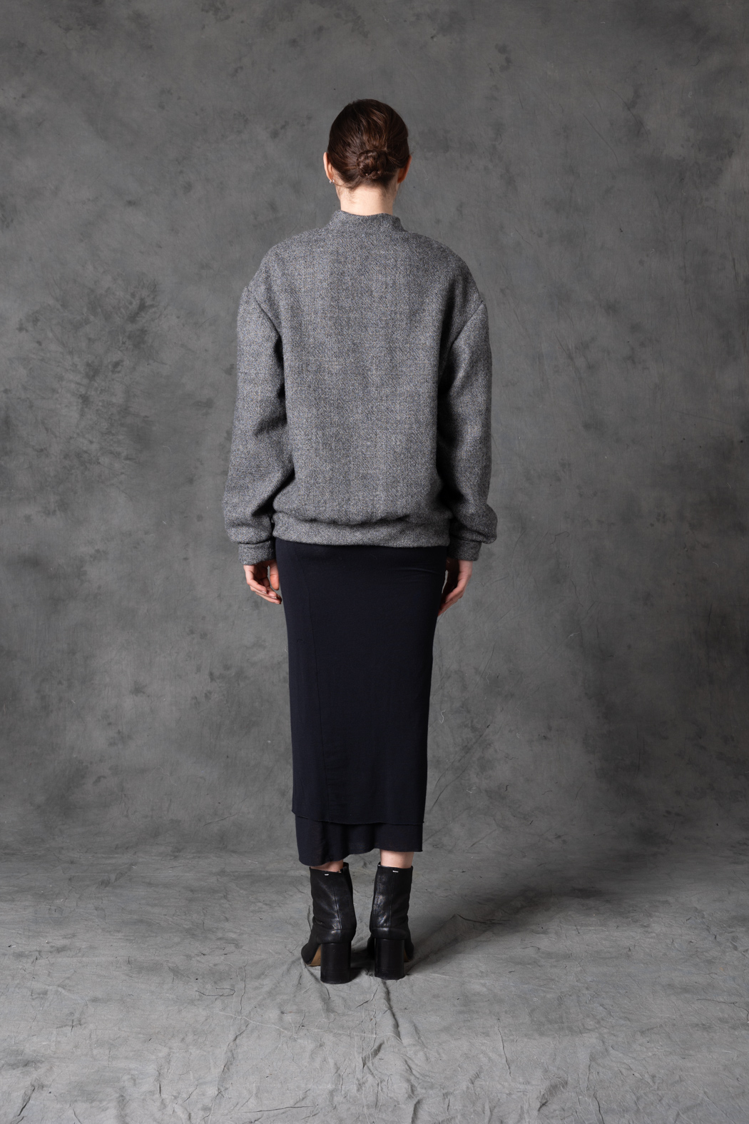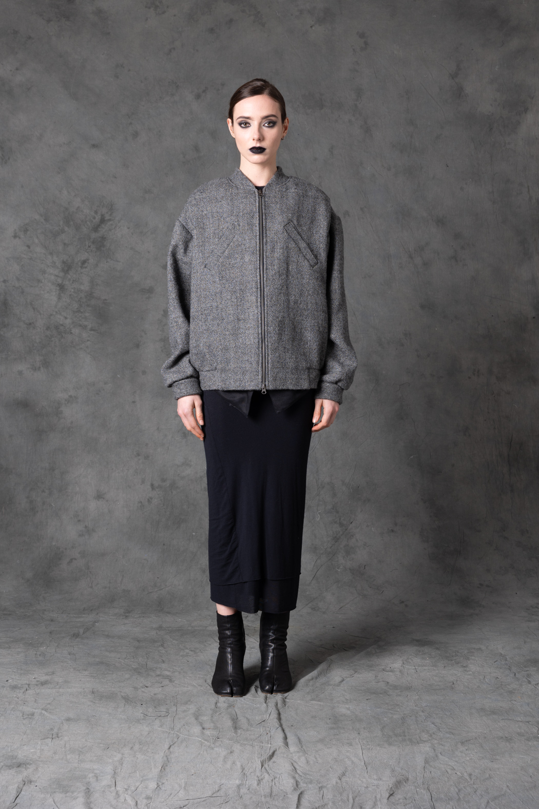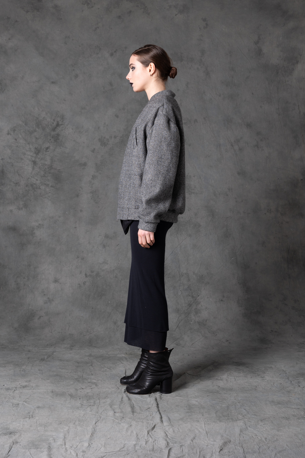 A sculptural tweed bomber combining softness and architectural form. Rounded shoulders and a precise cut create a modern silhouette with strong visual weight.